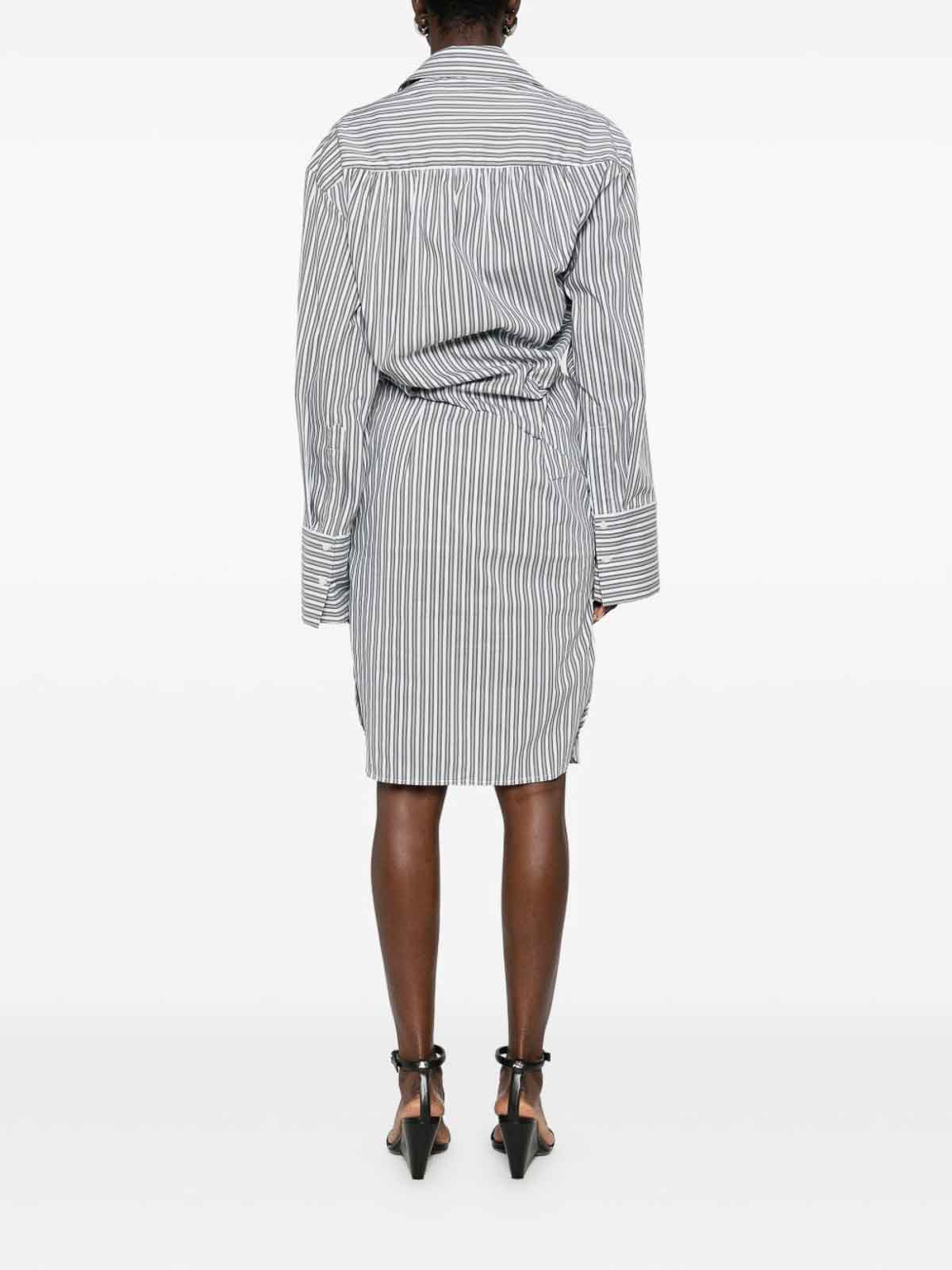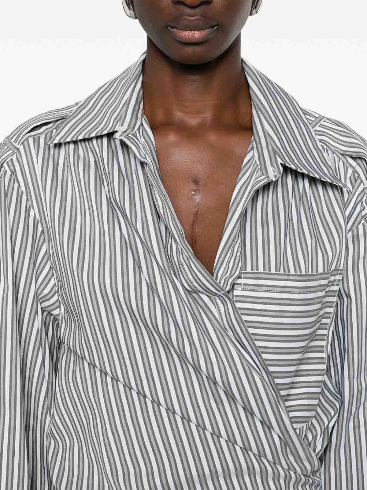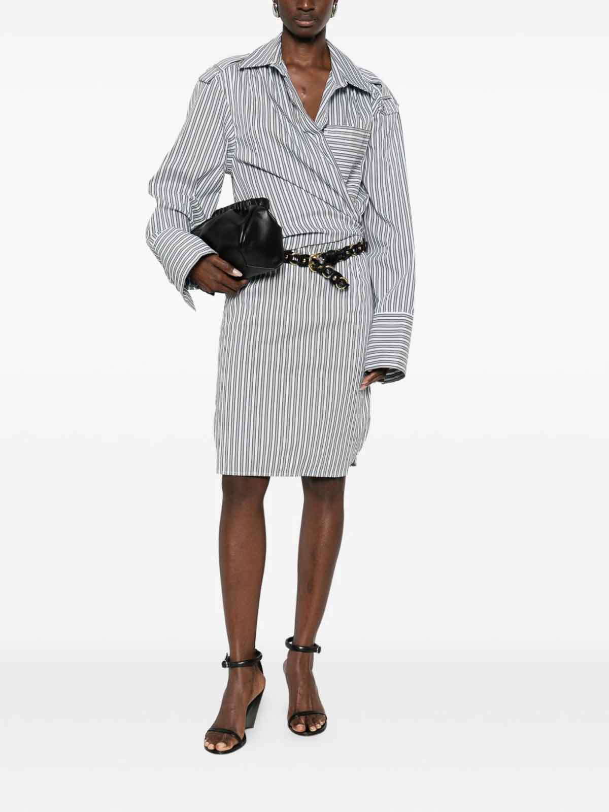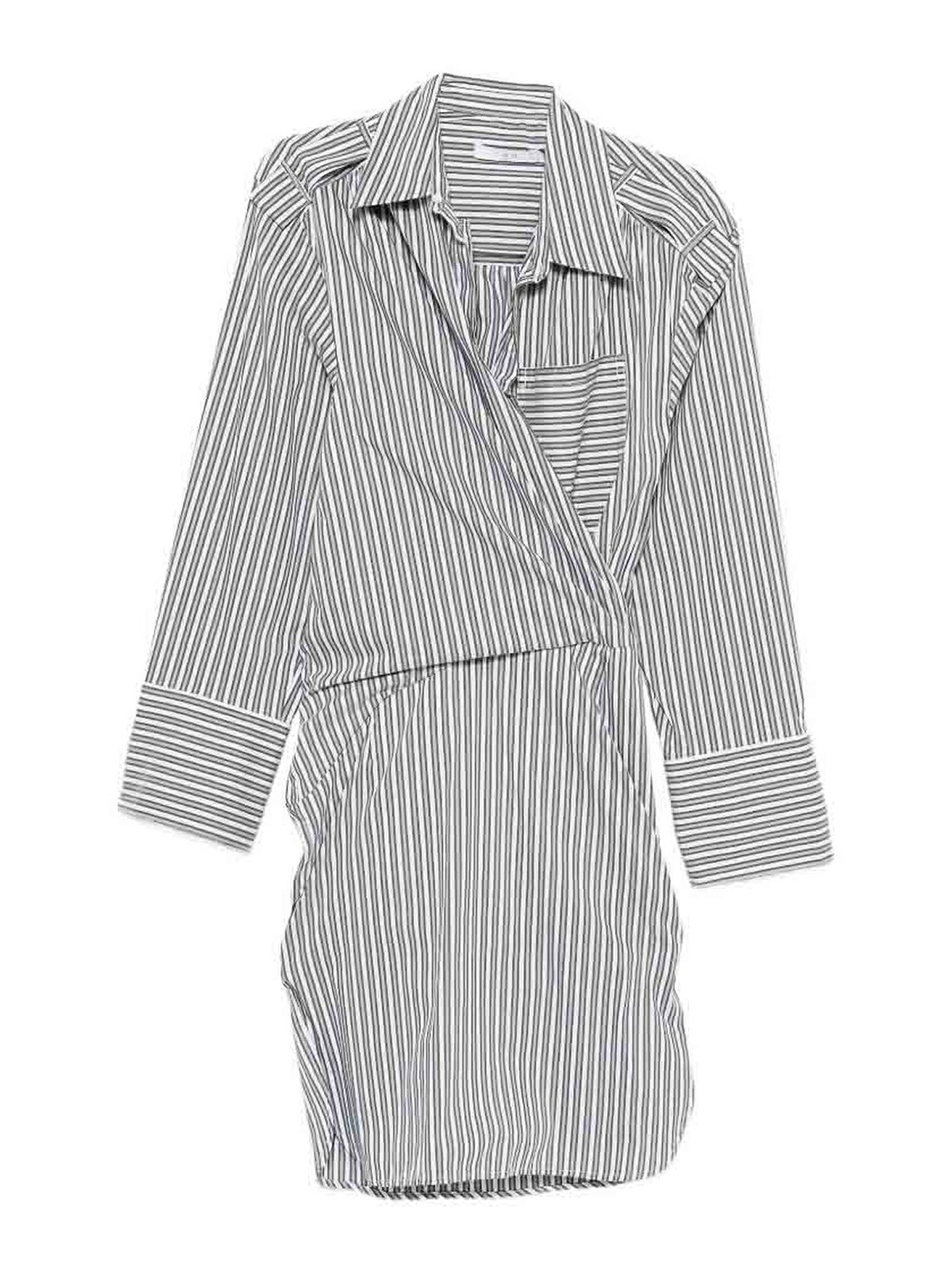 Blau/Grau/Weiß Streifenmuster, gerader Kragen, Brusttasche, lange Ärmel, Wickeldesign