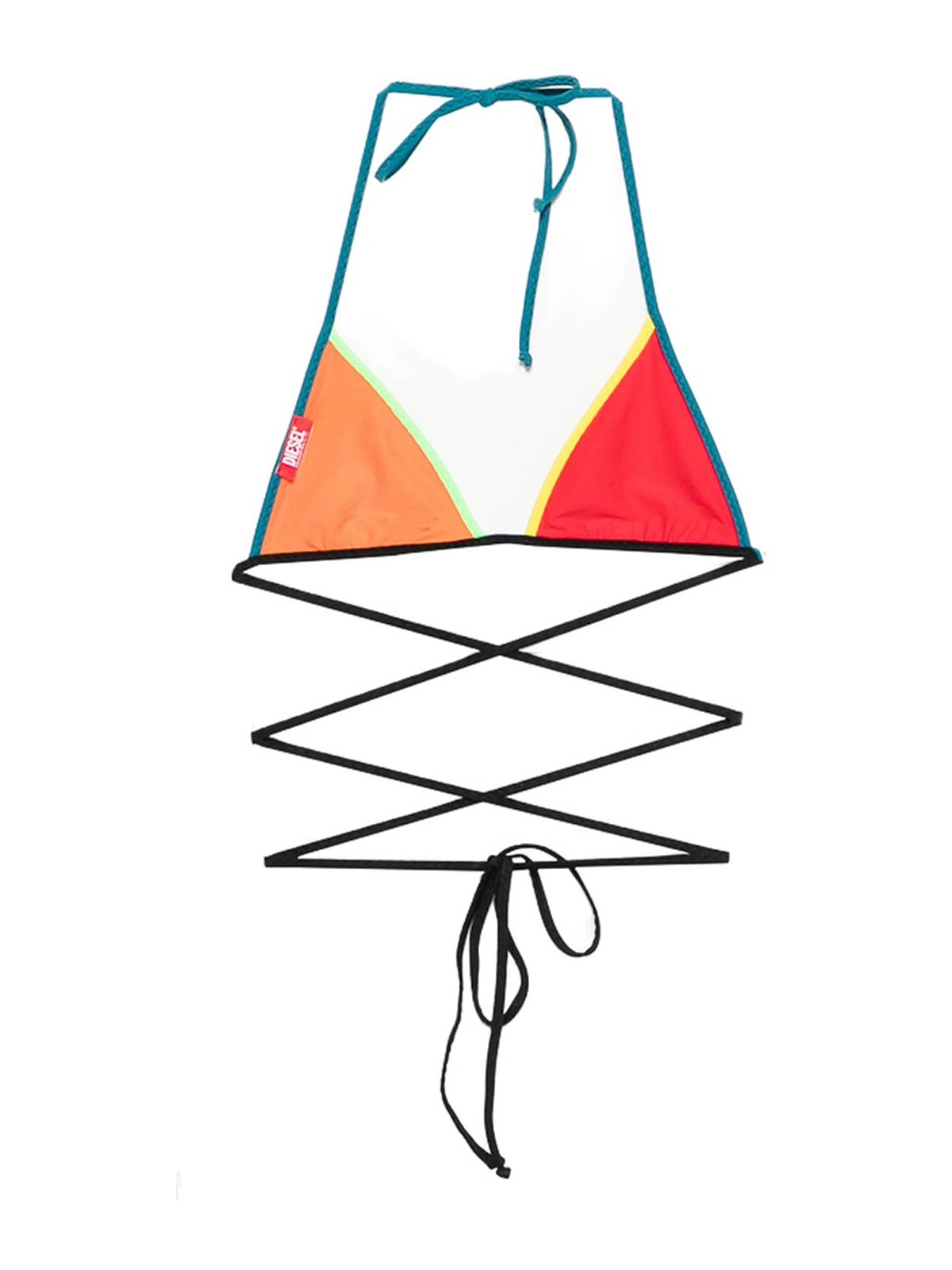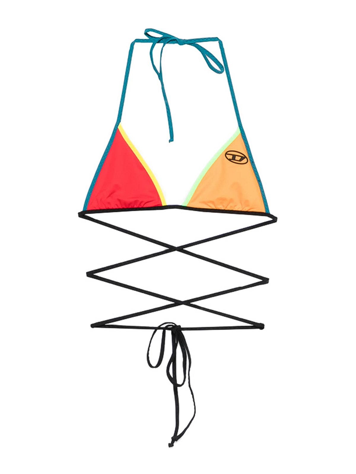 Rote, orange und mehrfarbige dreieckige Körbchen mit Bindeverschluss und Logodetail, kontrastierende Borten. Denken Sie daran, Bademode lieber anzuprobieren als Ihre eigenen Kleidungsstücke.