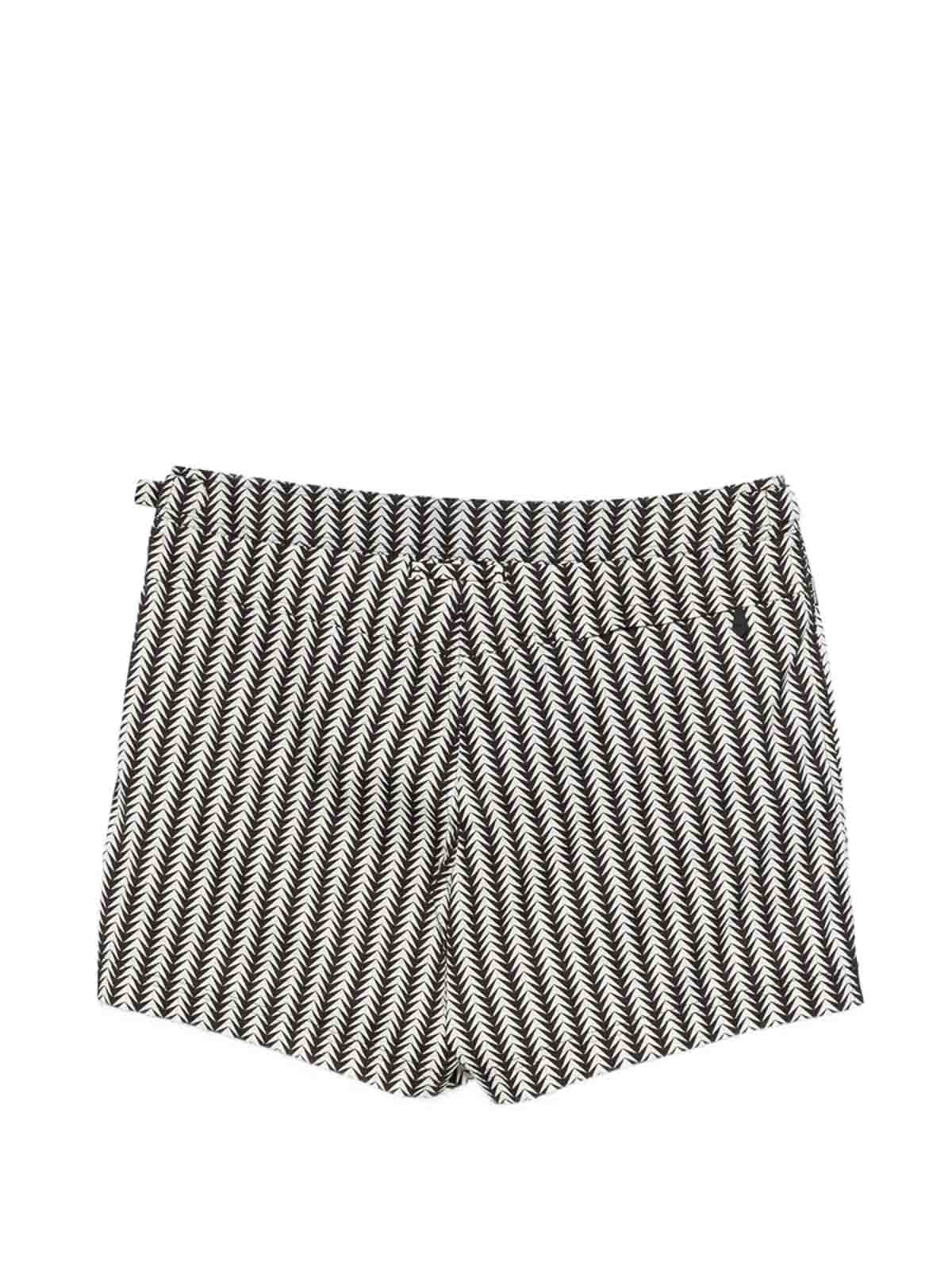 Weiße und schwarze Seitentaschen mit Fischgrätenmuster und seitlichen diagonalen Taschen Achten Sie darauf, Badekleidung lieber anzuprobieren als Ihre eigenen Kleidungsstücke.
