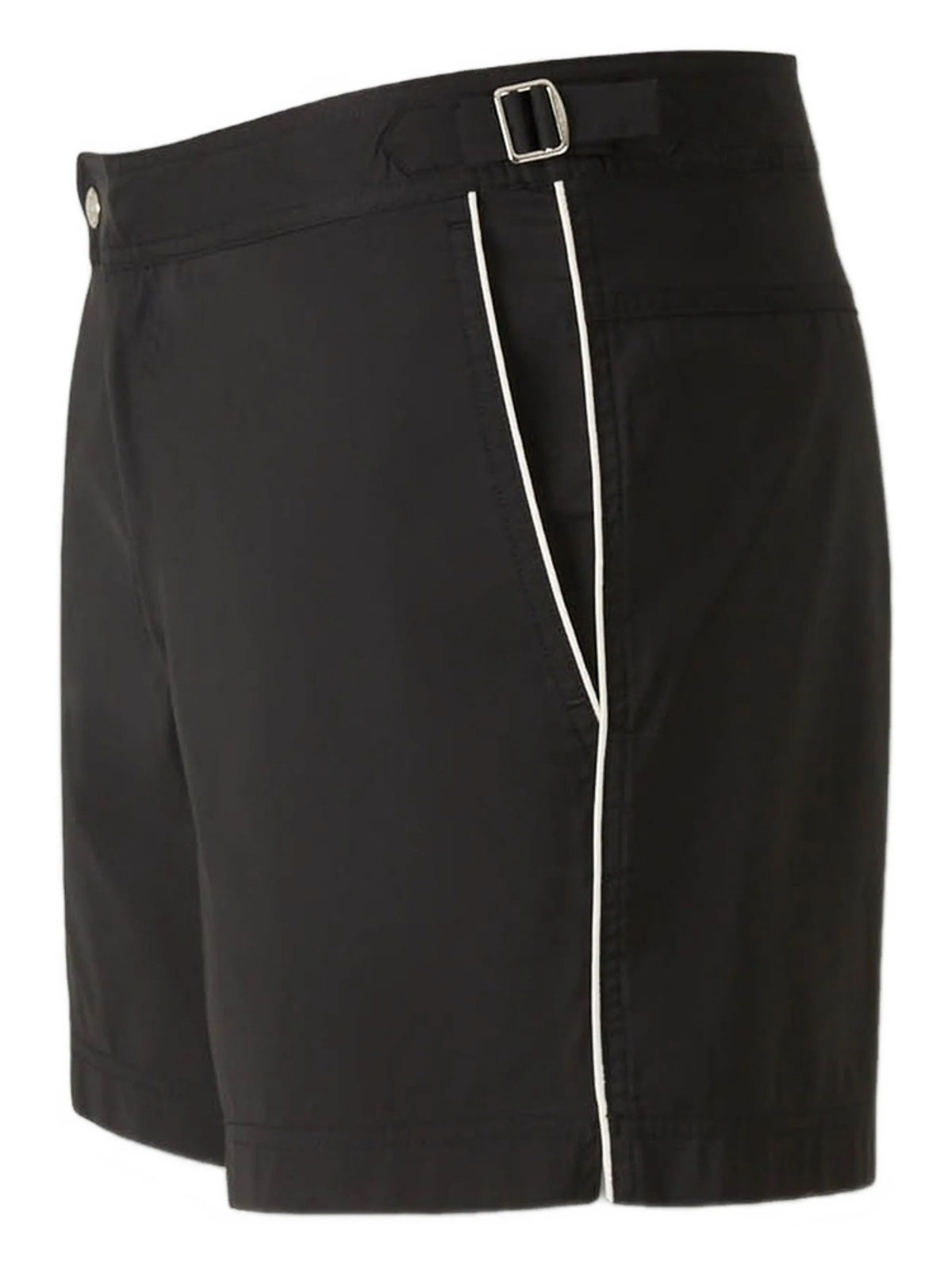 Schwarz-weißer Rand, Gesäßtasche, Reißverschluss, Schnallendetail. Achten Sie darauf, Badekleidung lieber anzuprobieren als Ihre eigenen Kleidungsstücke.