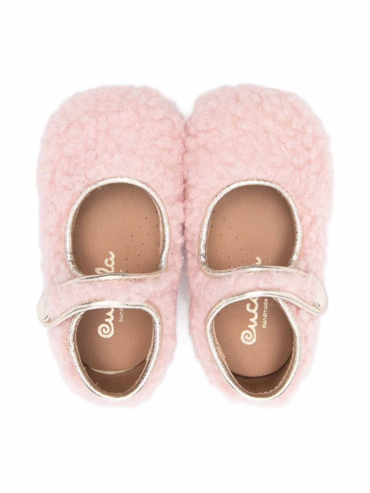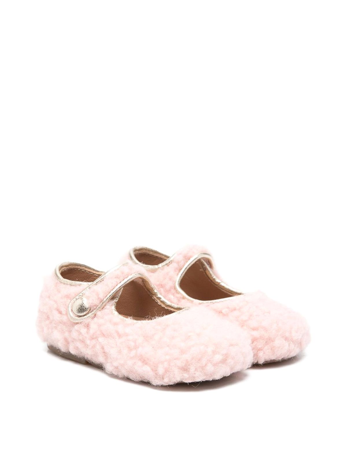 Ballerinas mit Riemchen und rosafarbenem Riemen und flacher runder Spitze