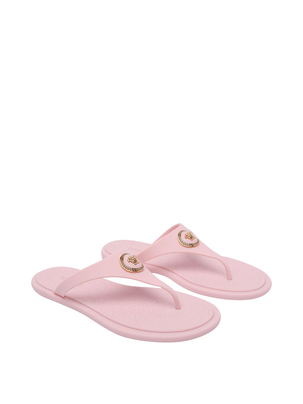 Rosafarbene Alia-Gummisandalen von Versace, runde Spitze, goldenes Medusa-Logo auf der Vorderseite