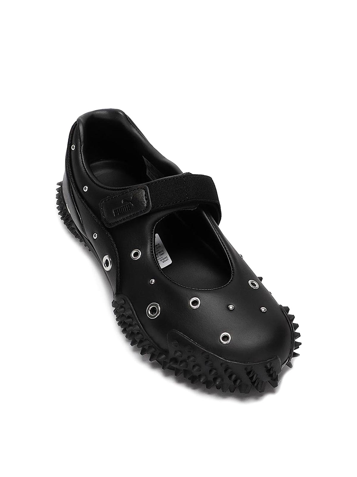 Schuh mit runder Spitze, Klettverschluss, flachem Absatz, Metallnietendetail am Obermaterial.