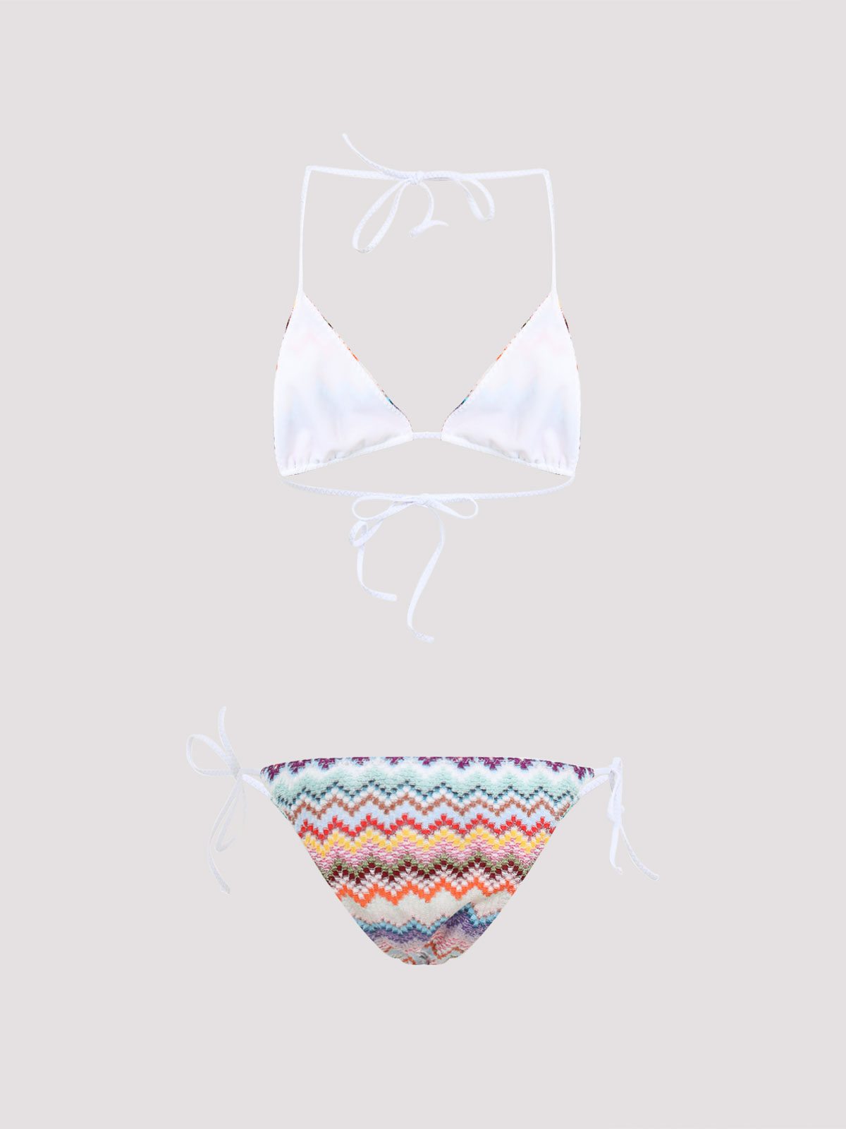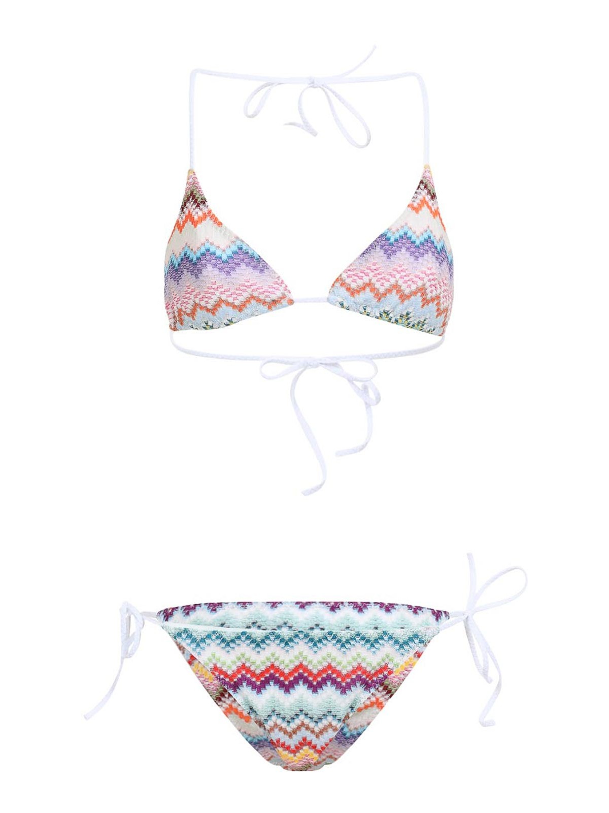 Missoni Bikini aus mehrfarbiger Viskose. Hergestellt aus einer Mischung aus mehrfarbiger Zickzack-Viskose und Lurex, Triangel-Top mit Schnürverschluss auf der Rückseite, farblich abgestimmter Slip mit seitlichem Schnürverschluss, komplett gefüttert.