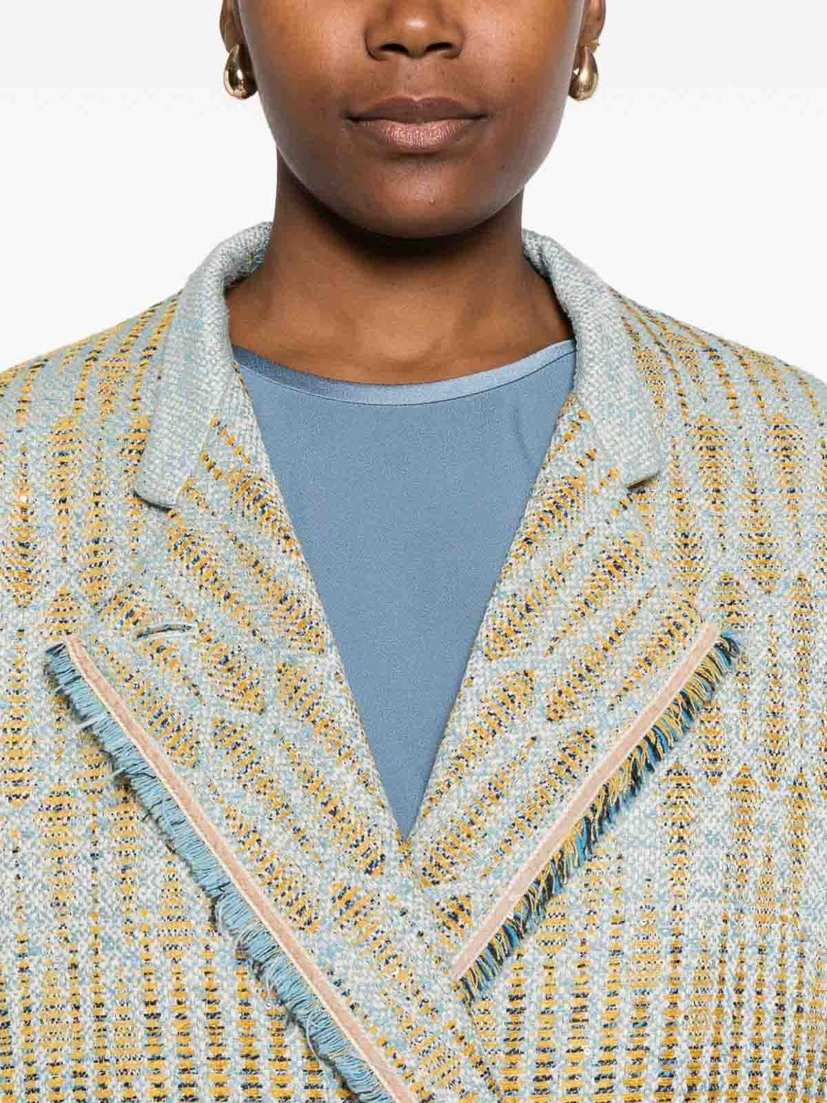 Blaue Schmetterlingsverzierung, ausgefranste Kanten, zweireihige Leistentaschen mit Knopfverschluss