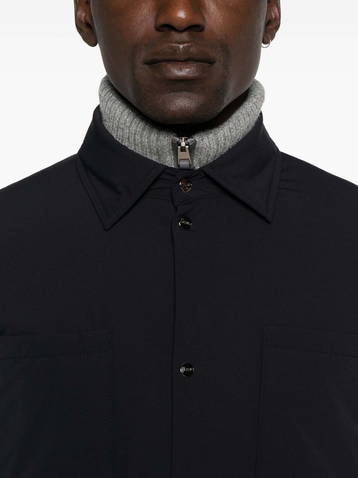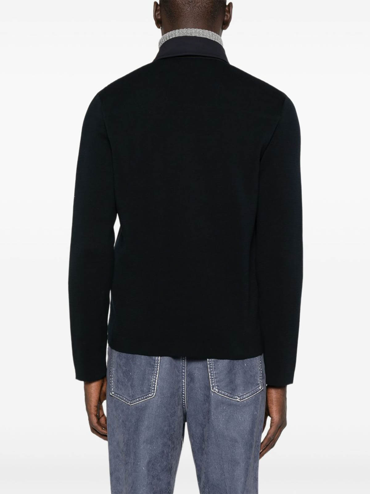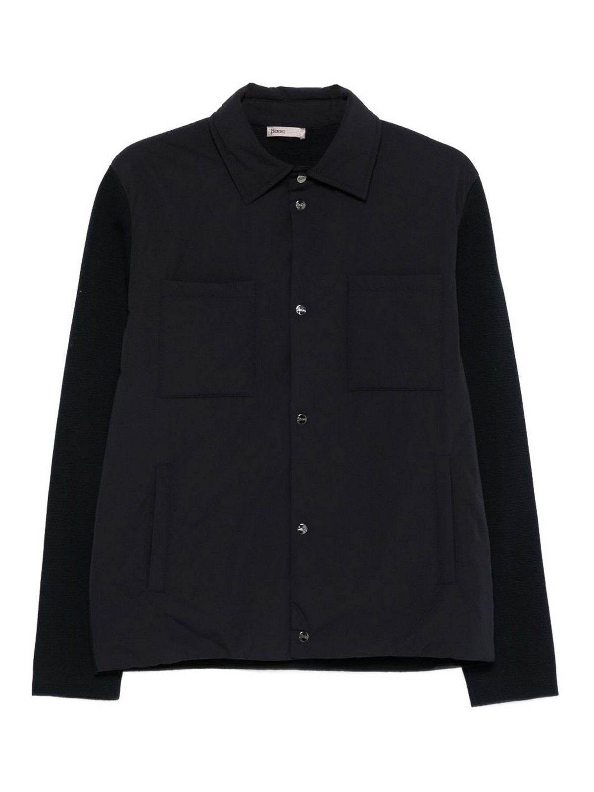 Blauer Knopfverschluss, aufgesetzte Taschen, Strickärmel