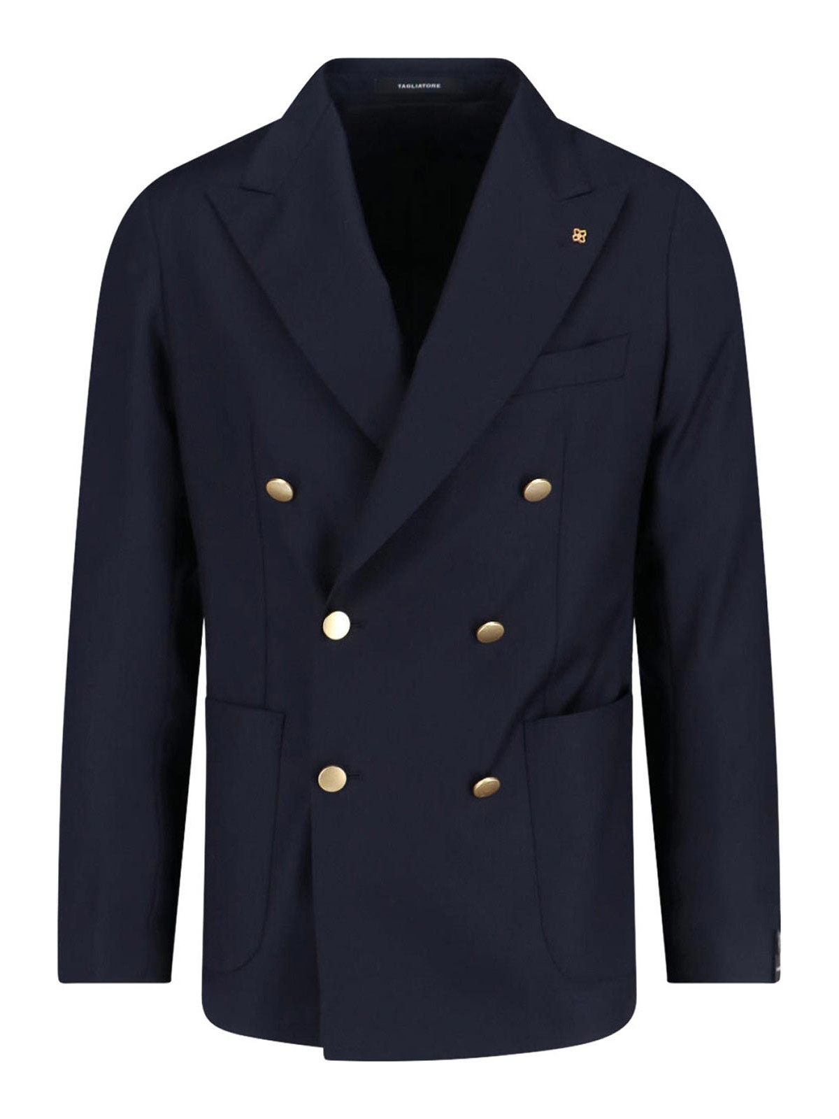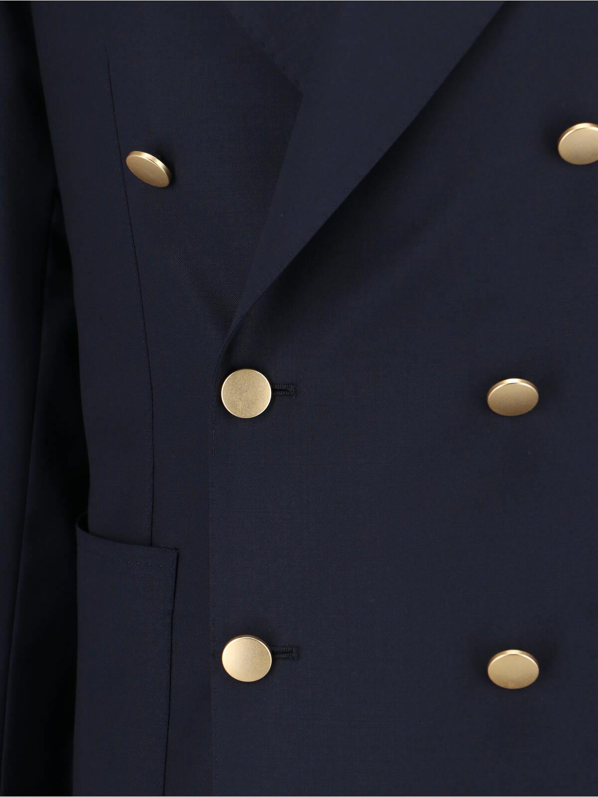 Zweireihiger Blazer aus Tagliatore-Schurwolle, exklusiv für Sugar, Blau, Marineton, Spitzenrevers, silbernes Metall-Logo-Detail, Knopfverschluss, Brusttasche, zwei Seitentaschen, geknöpfte Manschetten, gerader Saum.