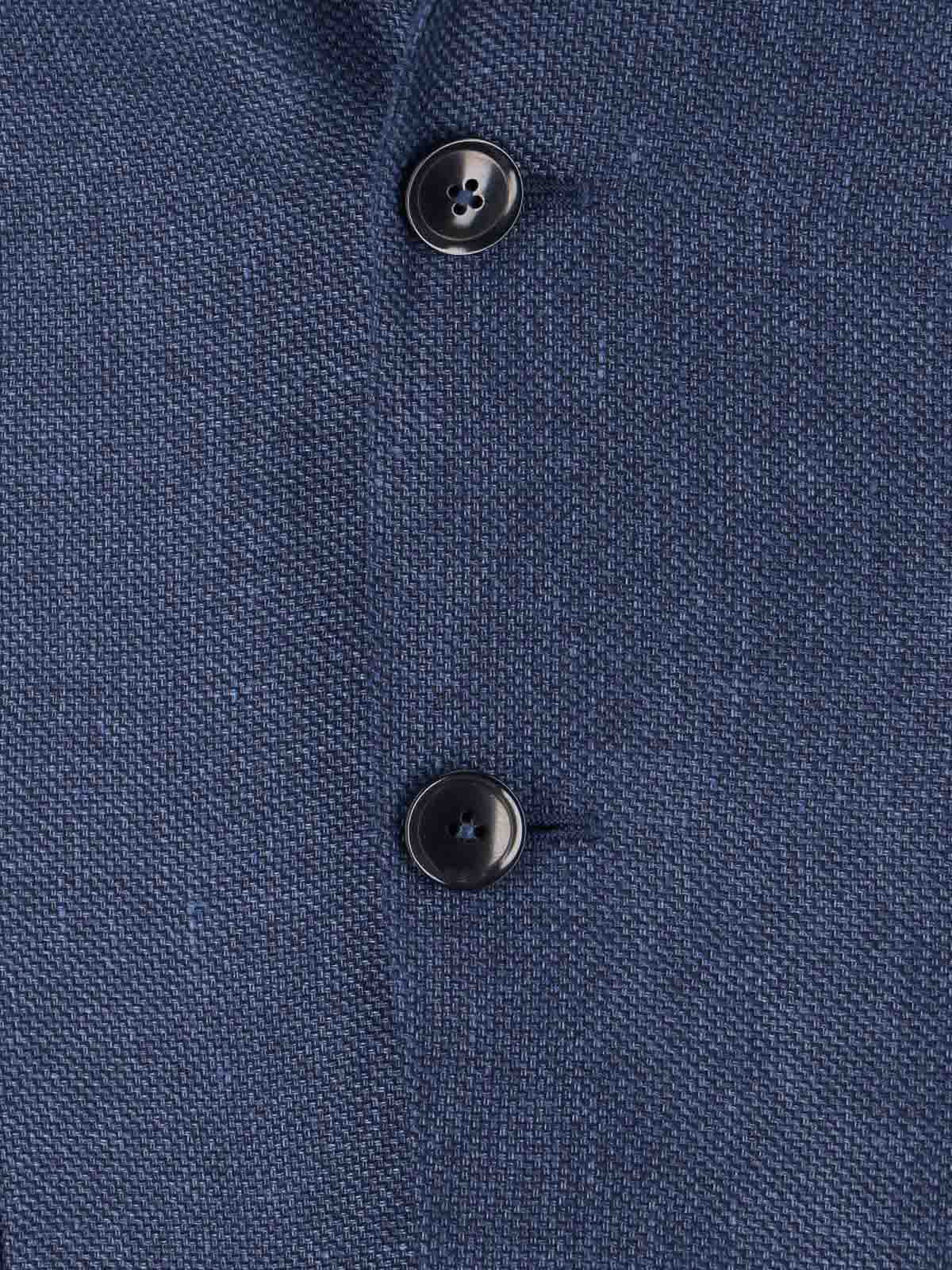 Einreihiger Blazer aus blauer Wolle und Leinen, Revers, lange Ärmel, einreihiger Knopfverschluss, zwei Fronttaschen.
