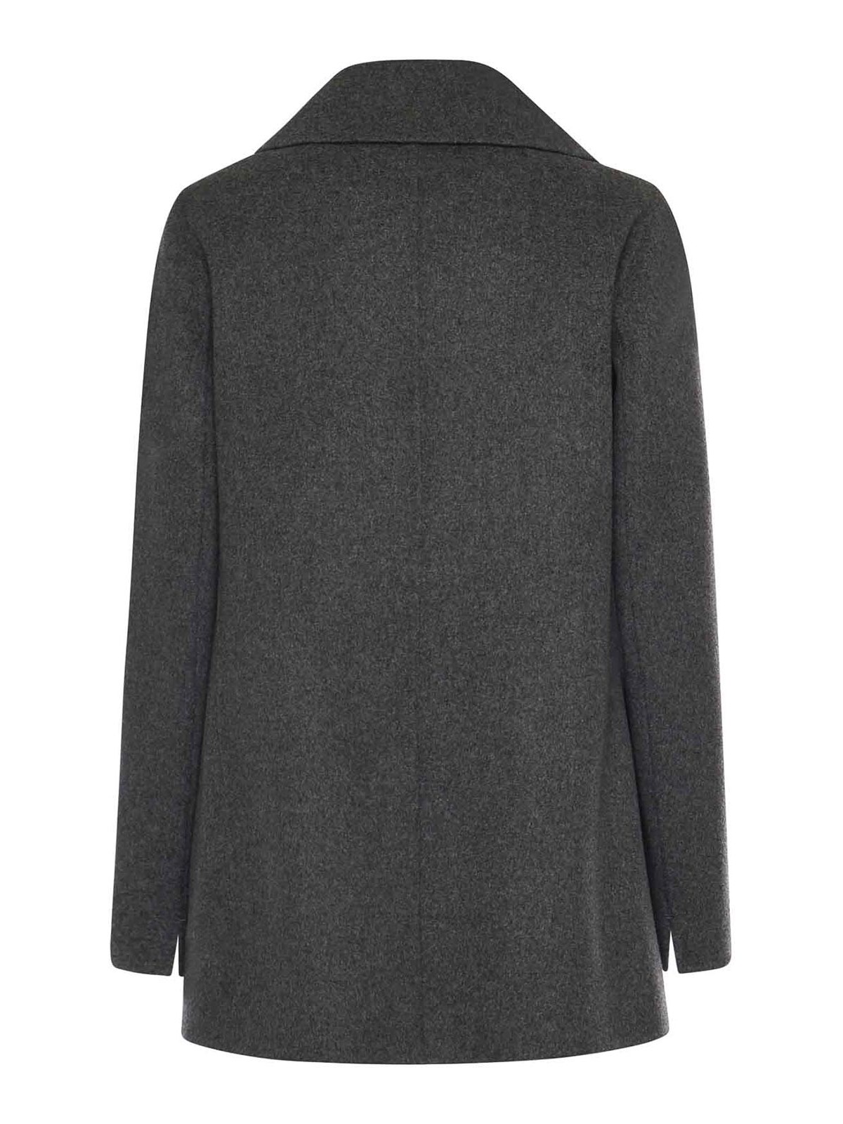 gefertigt aus zweilagiger reiner Wolle, Knopfverschluss, Reverskragen, Leistentaschen auf der Vorderseite, abgebildete Größe ist 40, hergestellt in Italien, Farbe: perlgrau