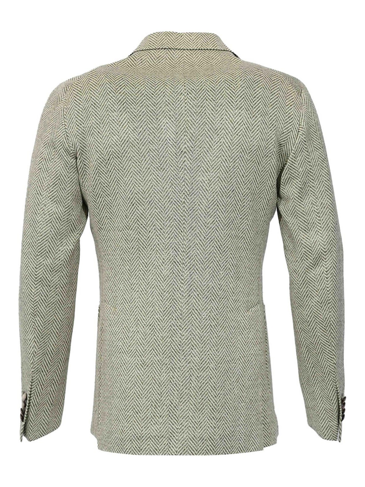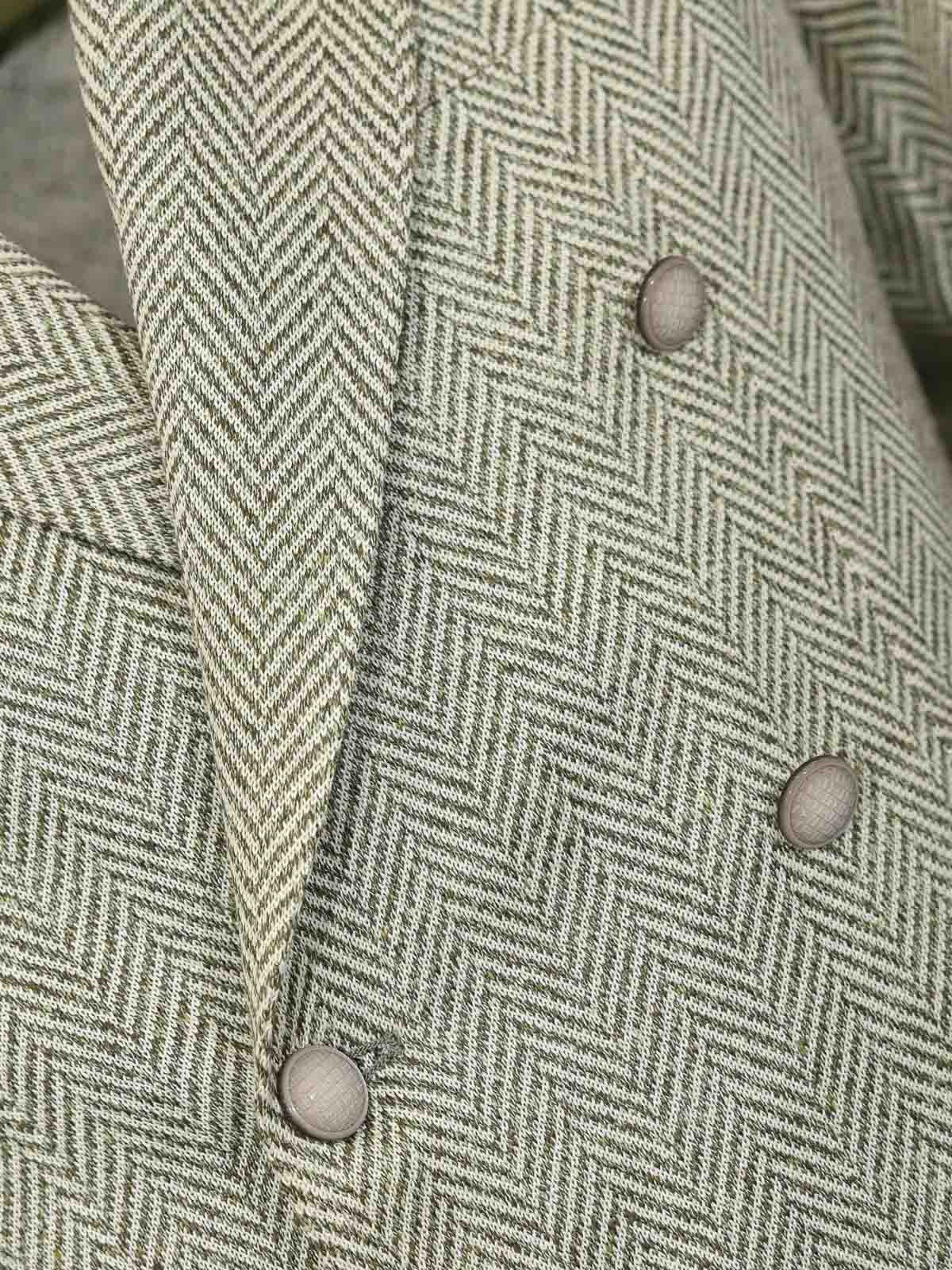 Herrenjacke aus Leinen- und Baumwollmischung, Clipper, Modell Montecarlo Jersey, Stoff: Jersey aus Leinen- und Baumwollmischjersey, Muster: Fischgrätmuster, Ärmel: lang mit Knöpfen an der Unterseite, Kragen: klassisches Revers, Verschluss: zweireihig mit Knöpfen, Taschen: Fronttaschen mit Klappe und Brusttasche, Details: Ton in Ton, am Revers applizierte ikonische Brosche, gefüttert: nein, Passform: schmal