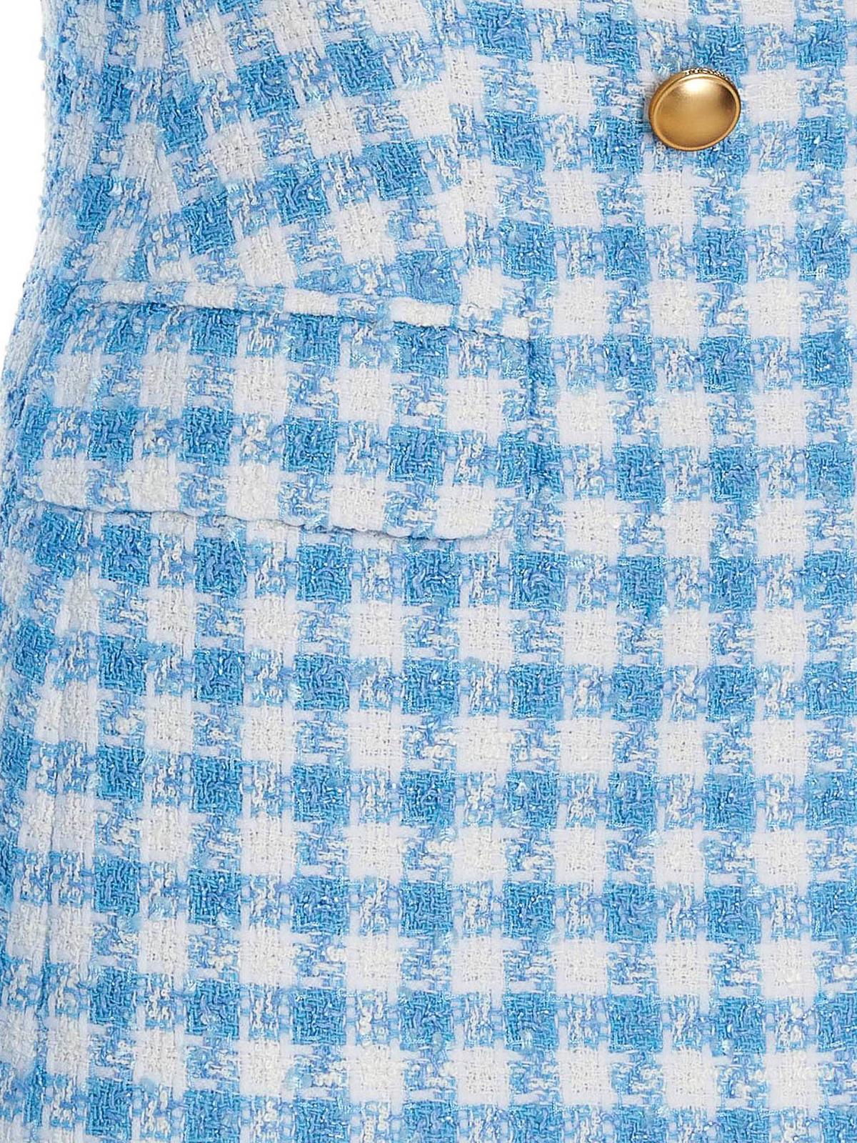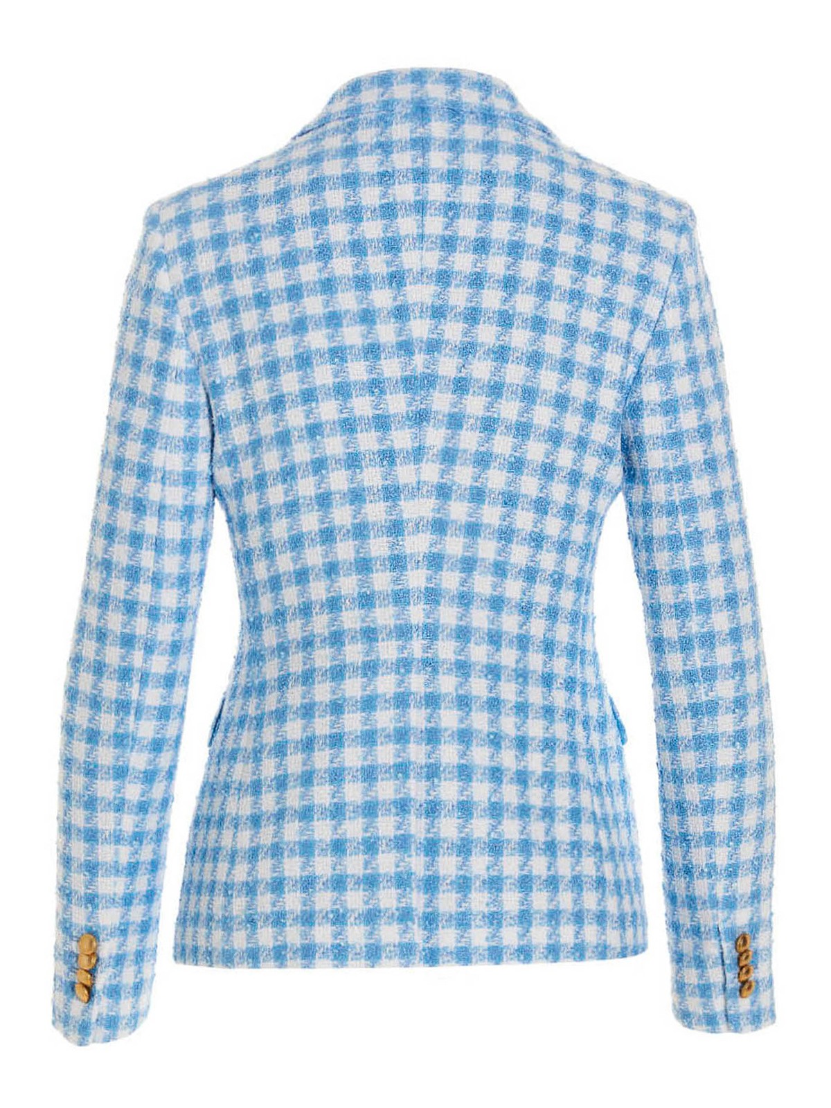 Doppelbrust-Blazerjacke aus einer Baumwollmischung mit Kapuzenmuster, mittigem Schlitz, rückseitigem Schirm, geraden Taschen und goldenem Knopfverschluss.