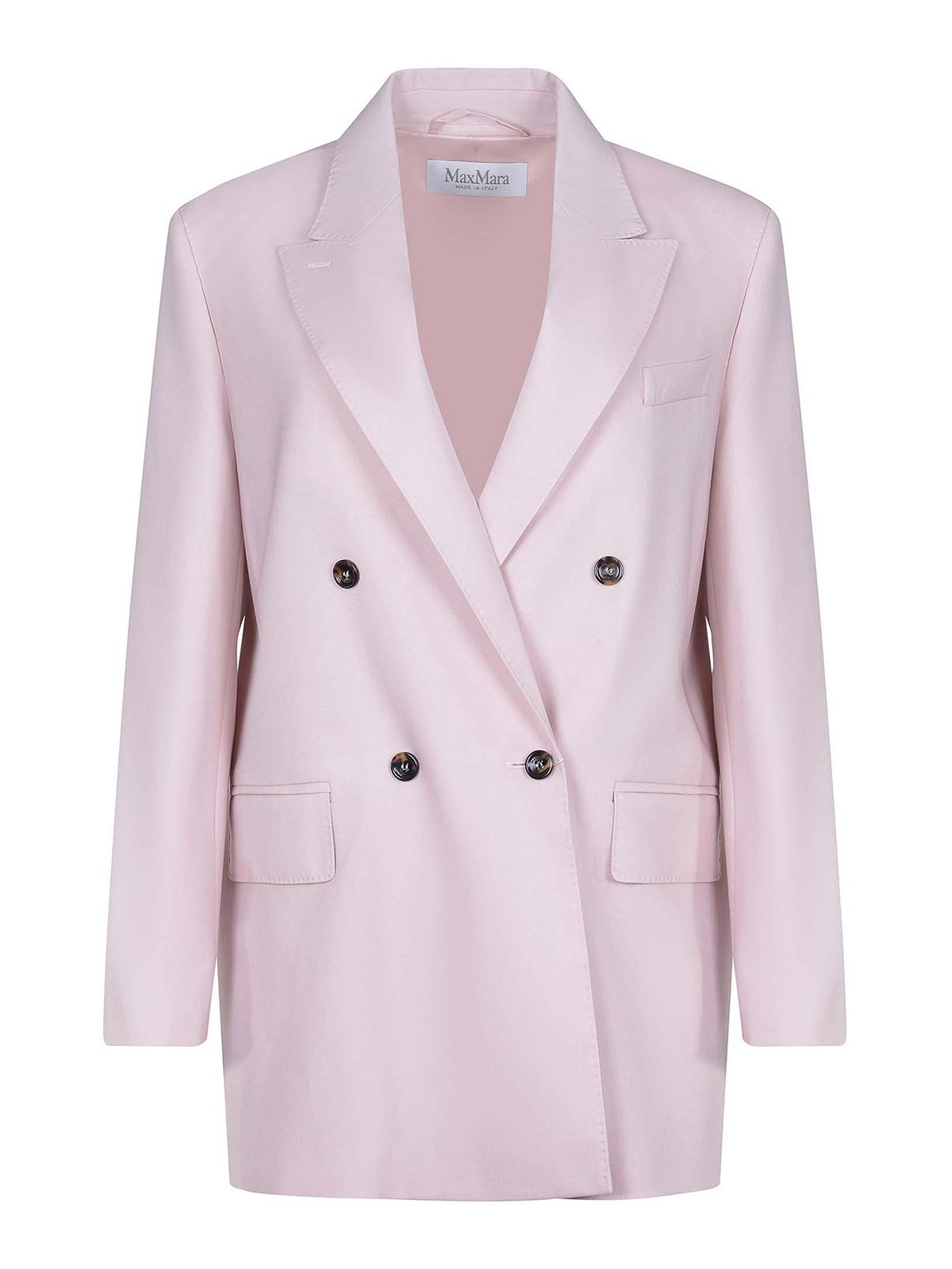Max Mara Mxmombrosa Blazer aus rosafarbener Wollmischung. Doppelreihig. Reverskragen. lange Ärmel. Manschetten mit Knöpfen. Knopfverschluss. Brusttasche. Seitliche Pattentaschen. 71% Schurwolle 18% Mohair 11% Seide Hergestellt in Italien