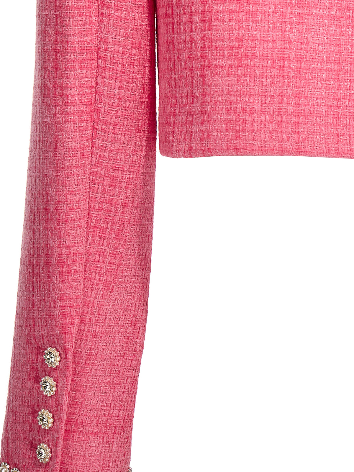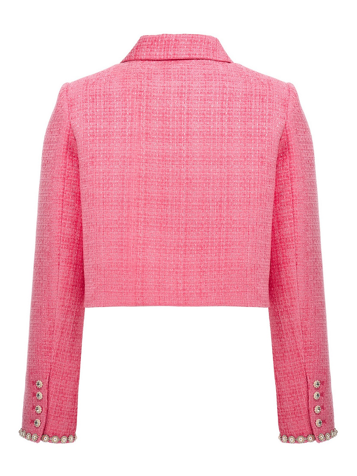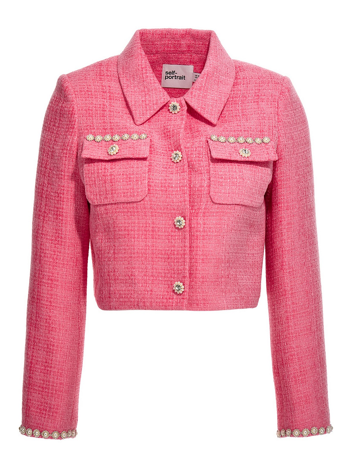 Kurz geschnittene Boucl-Jacke aus Boucl-Stoff mit langen Ärmeln, Perlenapplikationen und Kristallen am Saum, Schmuckknopfverschluss und Knopftaschen