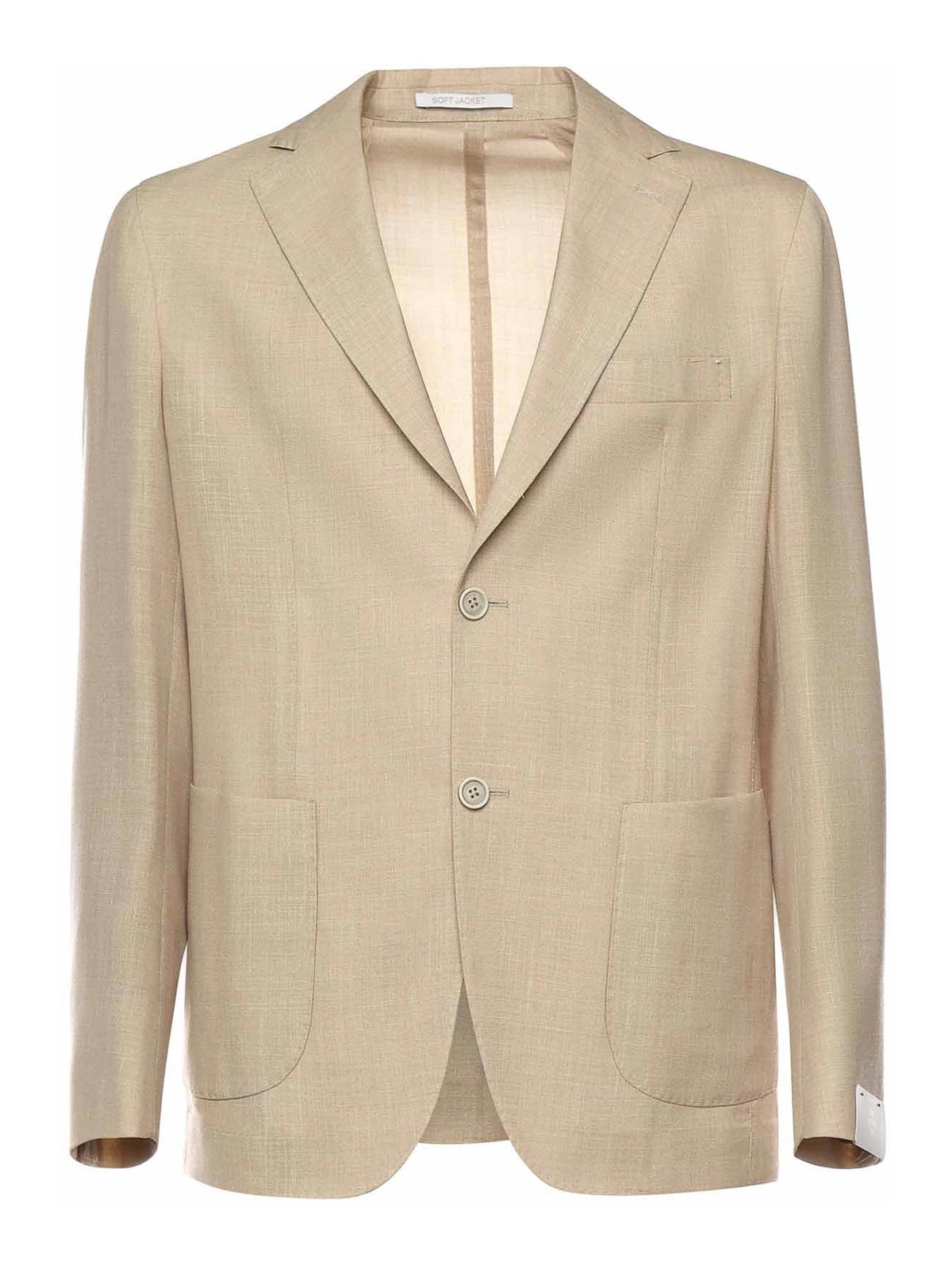 gefertigt aus Wolle, Seide und Leinen, aufgesetzte Taschen, Einstecktuch, einreihiger Zweiknopfverschluss, gekerbter Revers, reguläre Passform, Hergestellt in Italien,