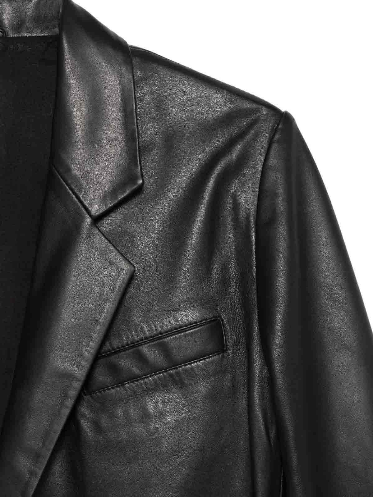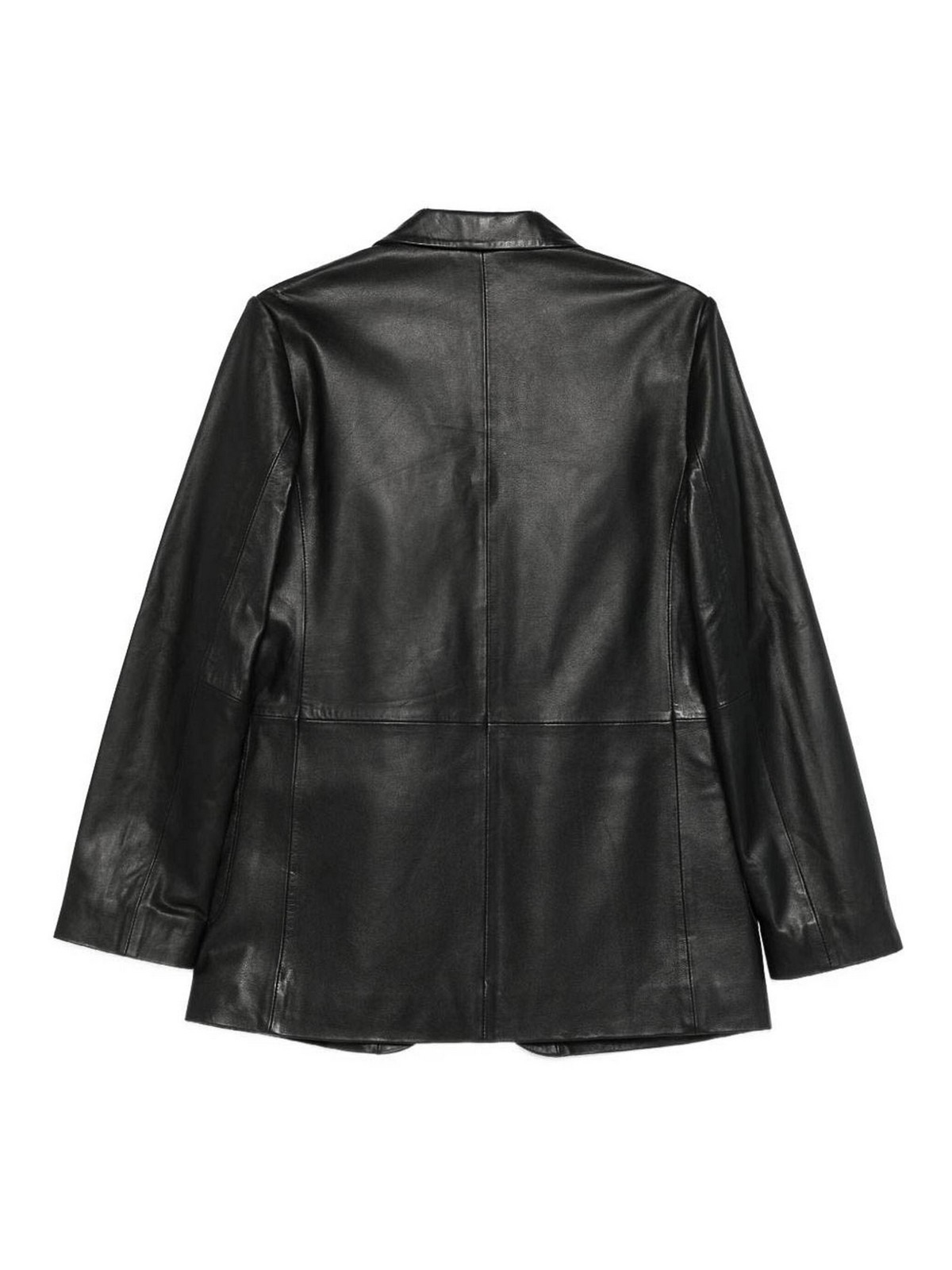Schwarz, Leder, gekerbtes Revers, lange Ärmel.
