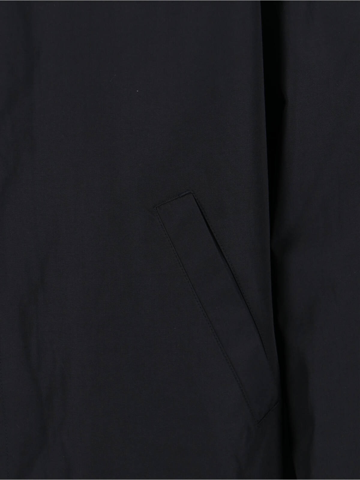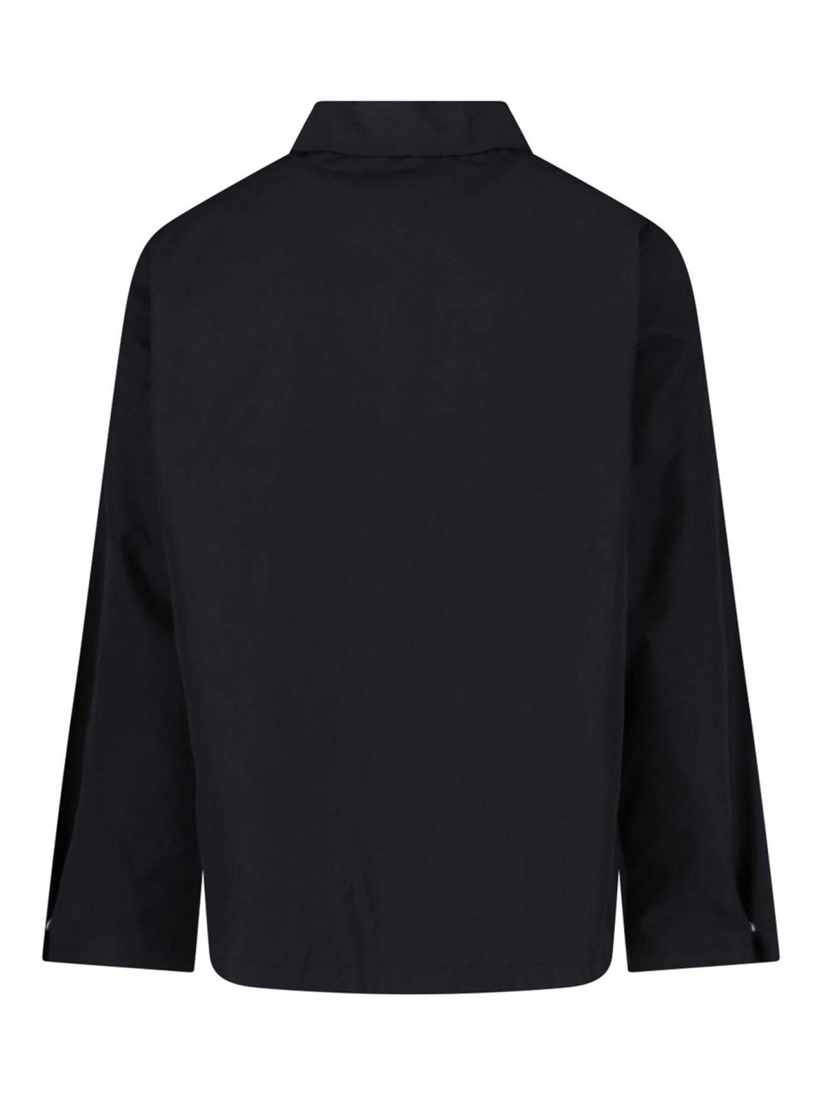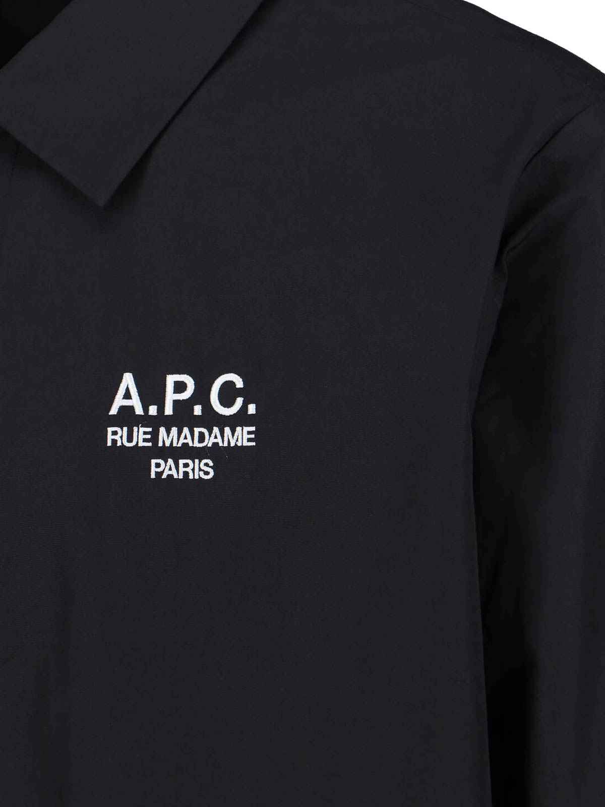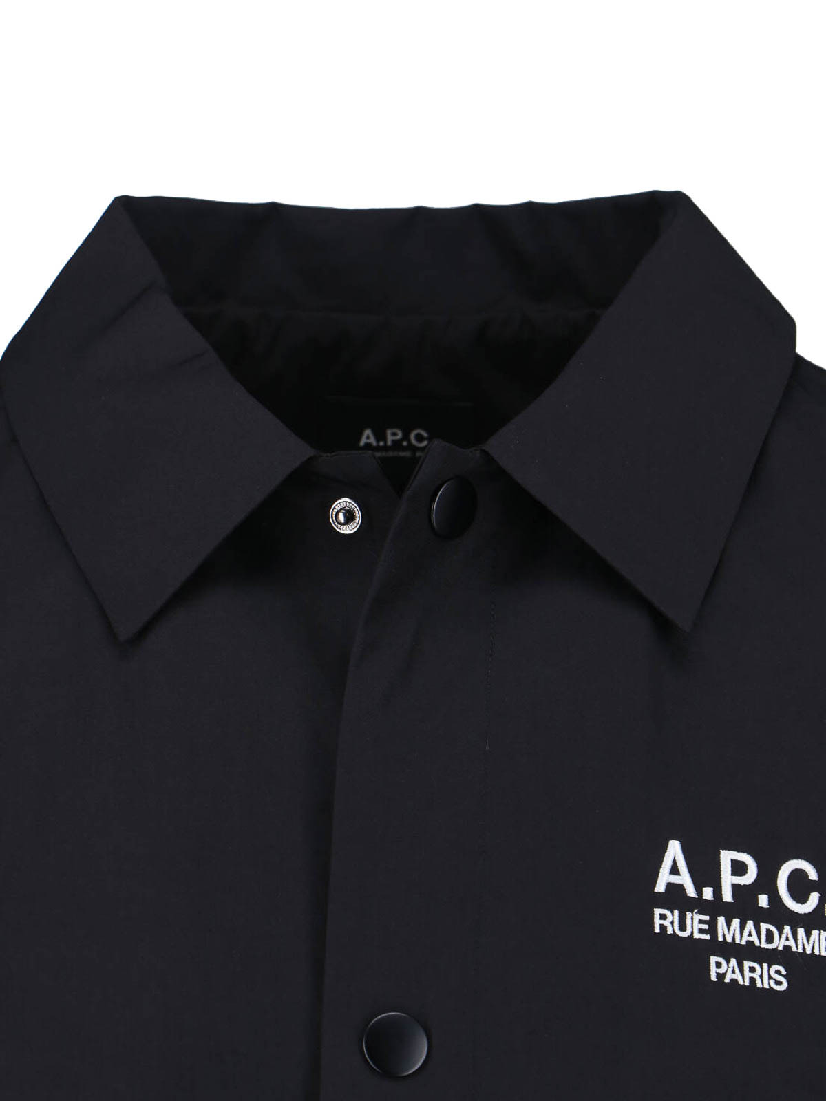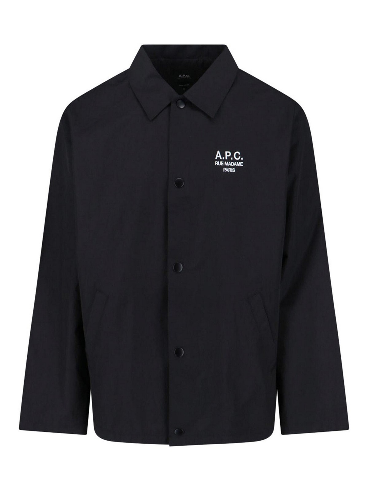 Regis A.P.C. Jacke aus schwarzem Stoff, klassischer Kragen, Knopfverschluss auf der Vorderseite, lange Ärmel, kontrastierendes gedrucktes Logo auf der Vorderseite, Knopfmanschetten, gerader Saum.