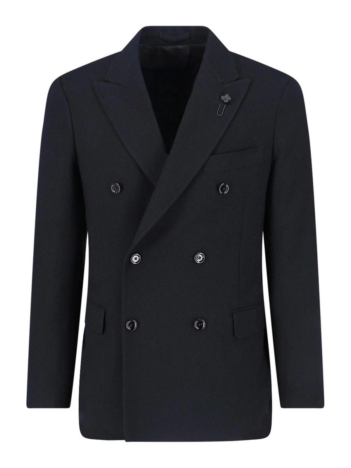 Zweireihiger Blazer von Lardini aus schwarzer Wolle, Revers, zweireihiger Knopfverschluss auf der Vorderseite, lange Ärmel, eine flache Tasche auf der Vorderseite, zwei seitliche Pattentaschen, Broschendetail, gerader Saum.
