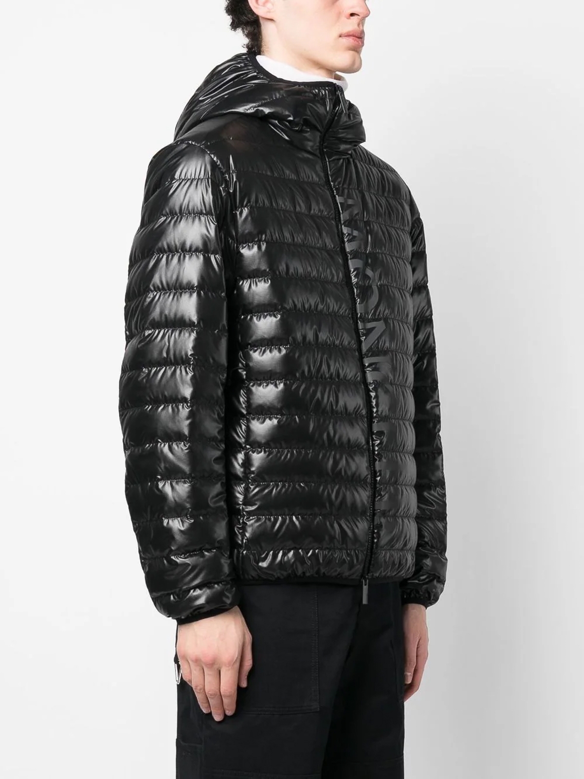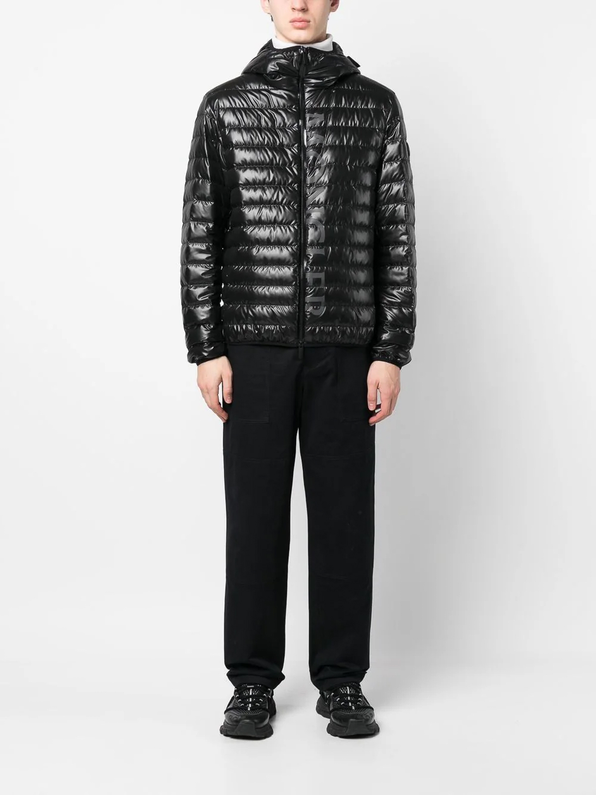 tiefschwarze, gepolstertes Design mit Federdaunen, gesteppter Logoprint auf der Vorderseite, Logo-Patch am Ärmel, klassische Kapuze vorne, Zwei-Wege-Reißverschluss, lange Ärmel, elastische Manschetten