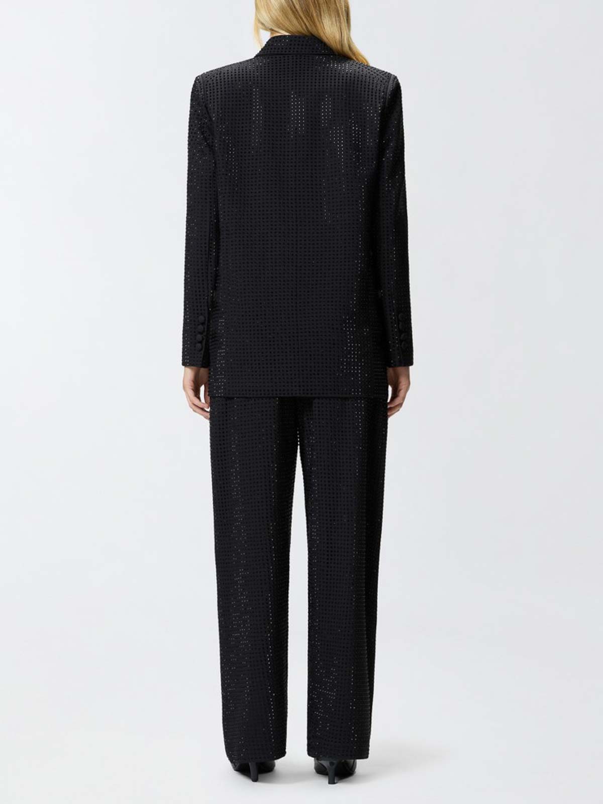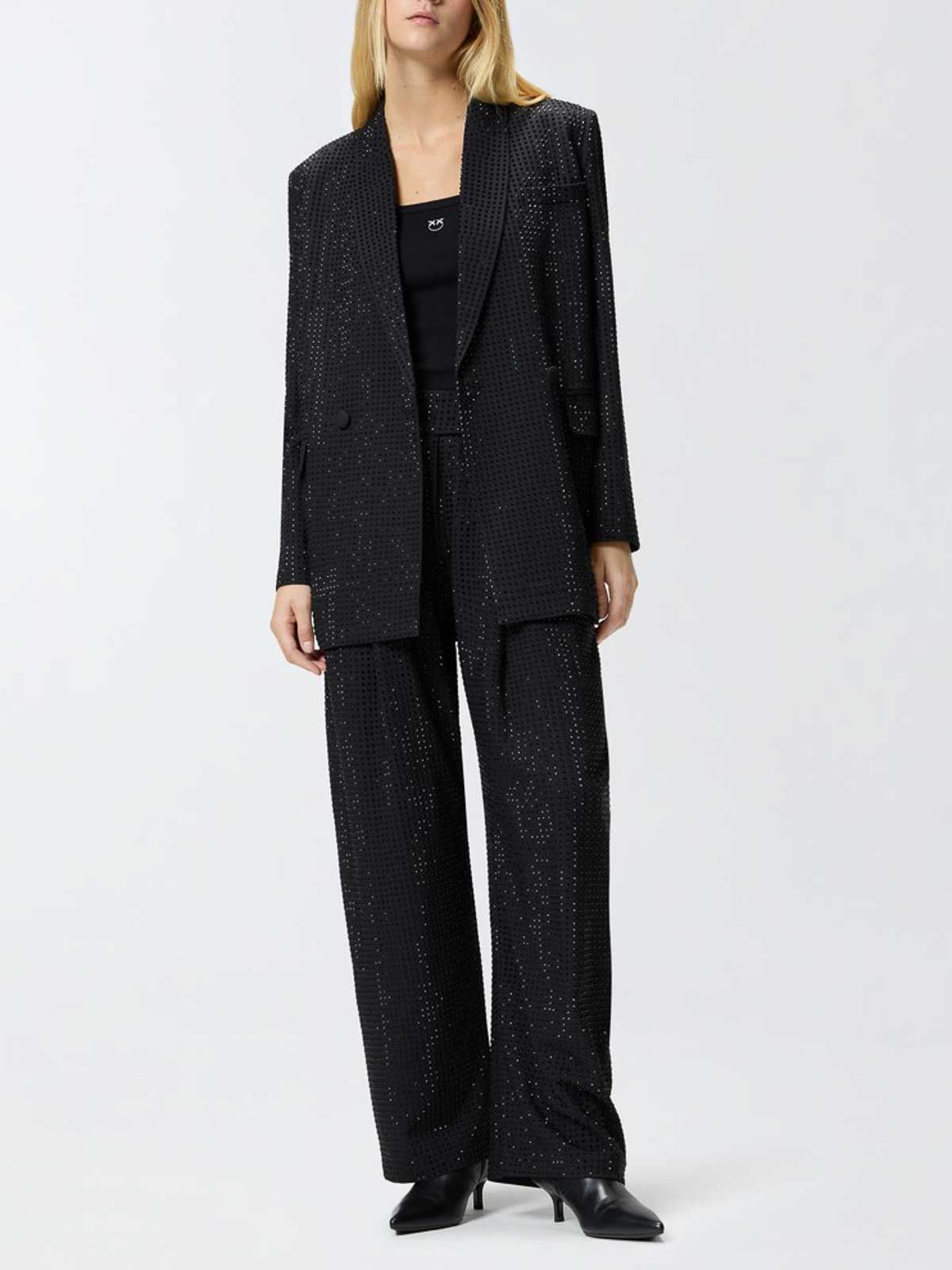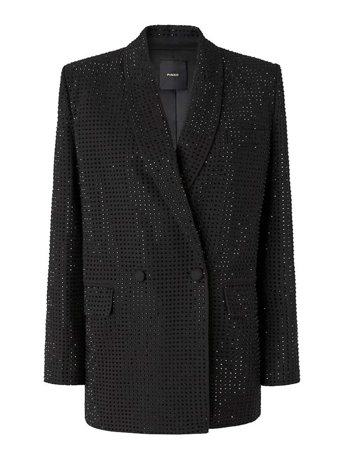 Pinko übergroßer zweireihiger Blazer mit Strasssteinen, hergestellt aus garngefärbtem Stretch-Viskose-Mischgewebe, verziert mit durchgehenden Strassapplikationen auf der gesamten Oberfläche des Kleidungsstücks.. die zweireihige Silhouette, mit Knöpfen befestigt, i