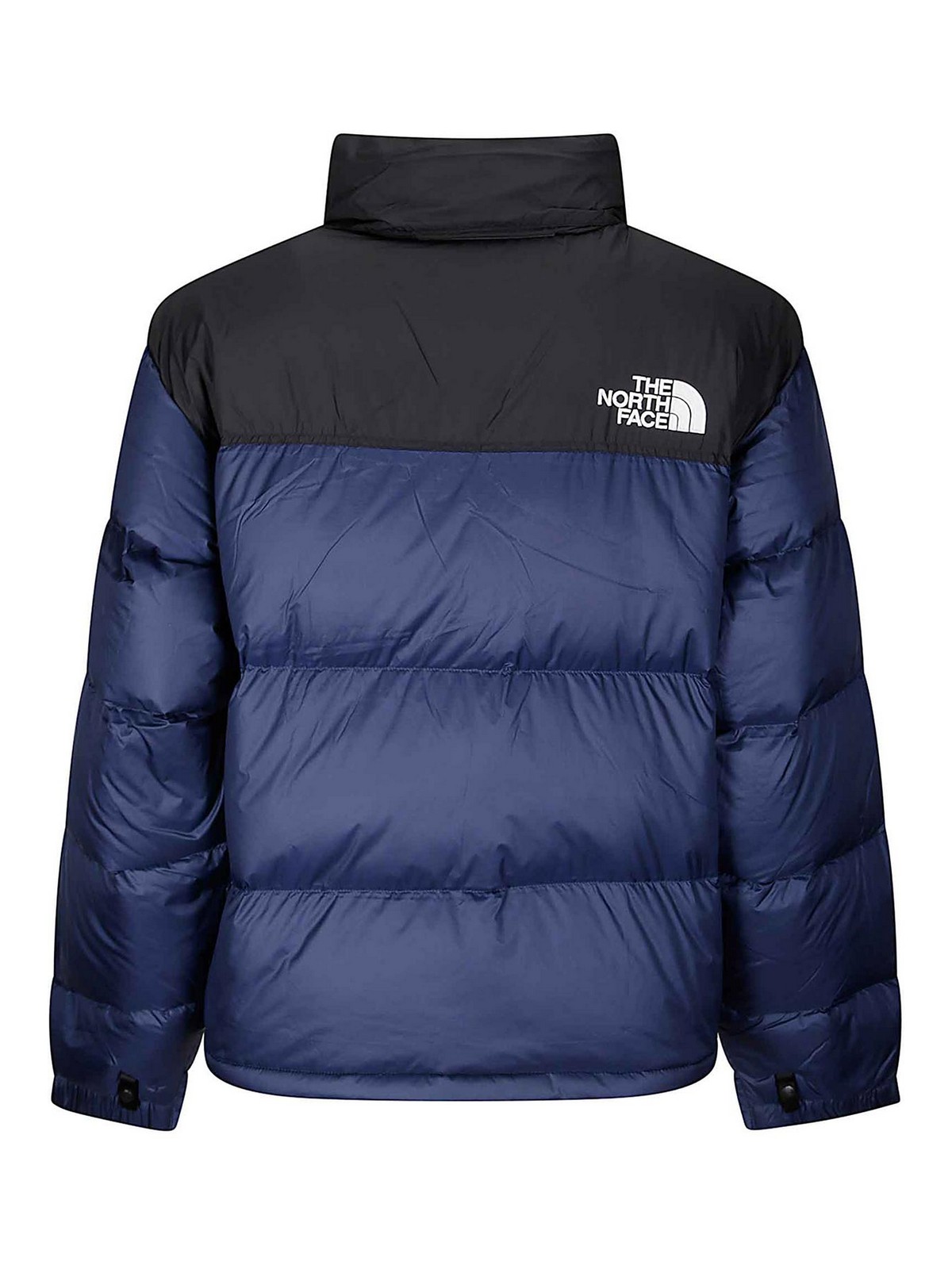 Einfache blauschwarze Daunenjacke mit gesticktem Logo auf Vorder- und Rückseite, Reißverschluss, Seitentaschen, hoher Kragen.