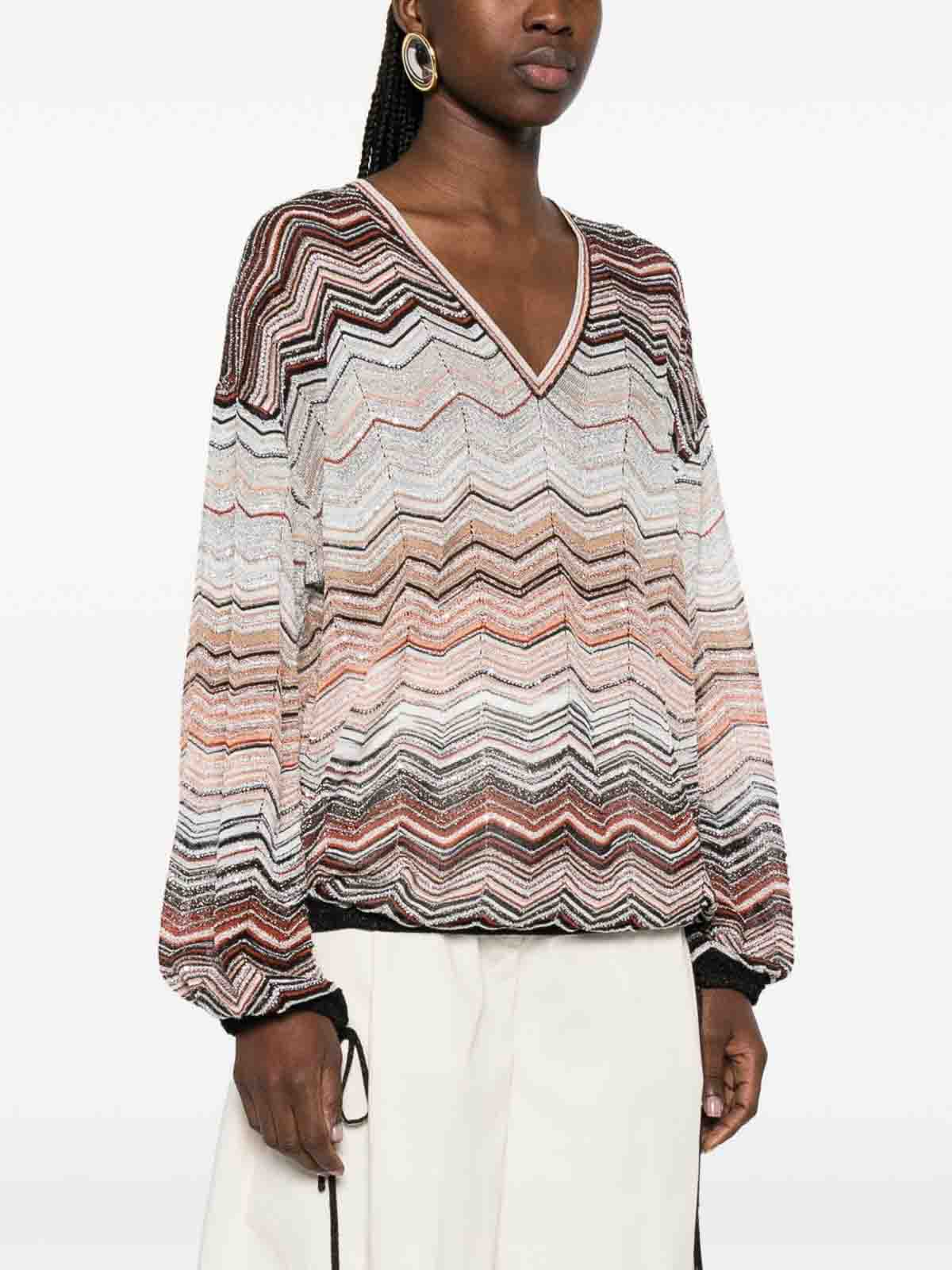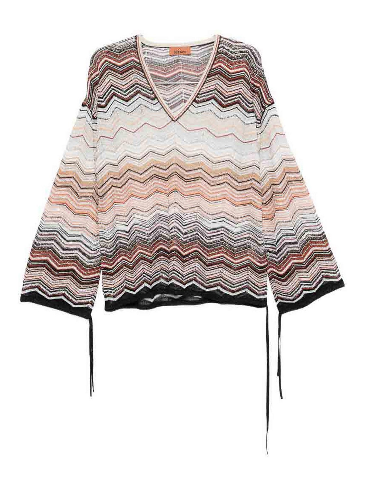 Herkunft: Italien, mit beigem Chevronmotiv, V-Ausschnitt, Knotendetail, lange Ärmel, gerippter Rand. Der Artikel kann leicht von der Abbildung abweichen. Dies liegt daran, dass Missoni-Produkte in Handarbeit hergestellt werden.