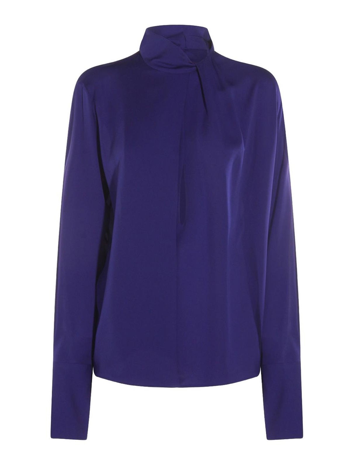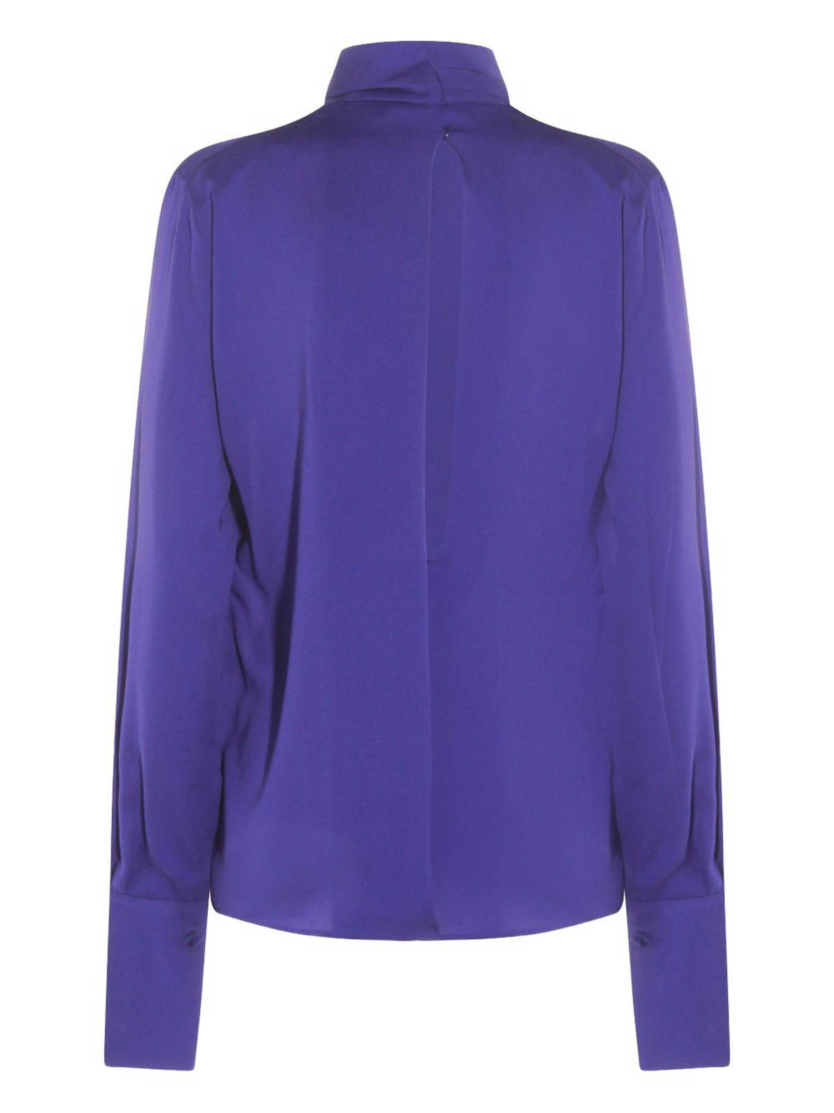 Clematis blau, Stehkragen, lange Ärmel, geknöpfte Manschetten, drapierter Ausschnitt