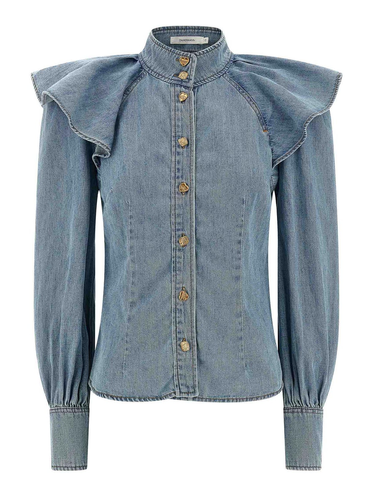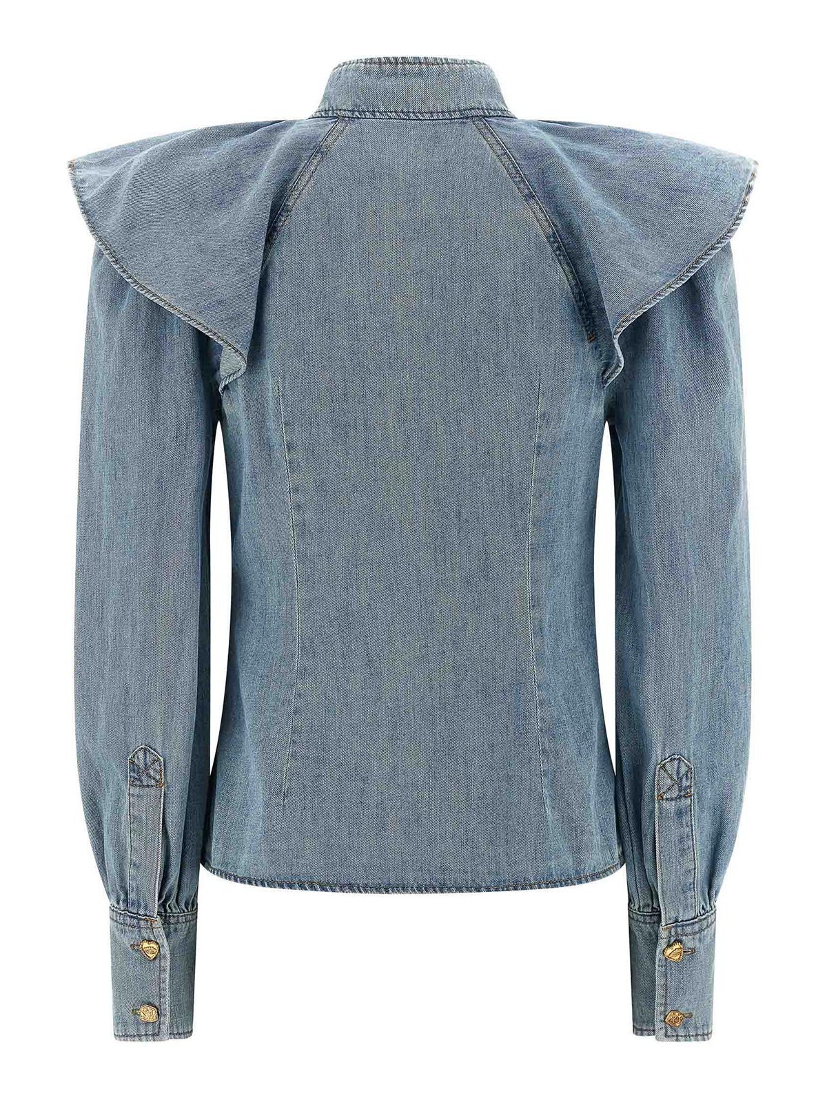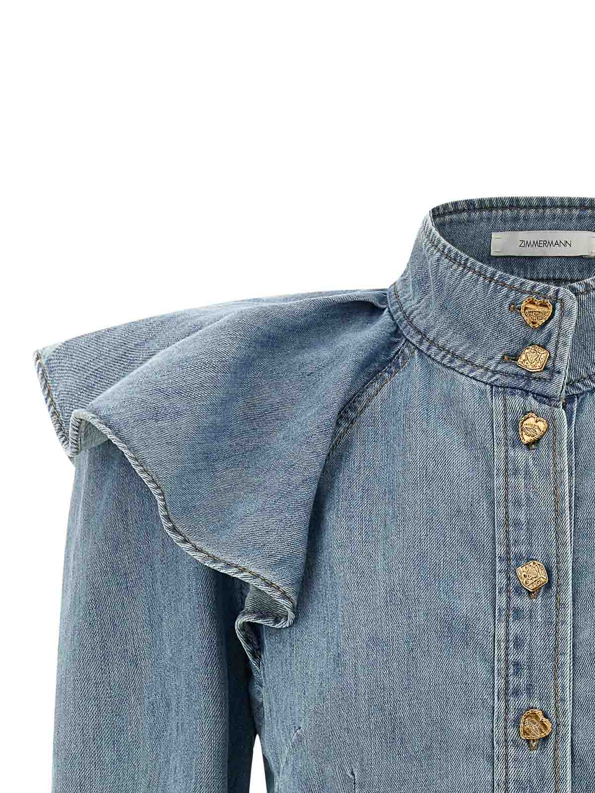 Jeansbluse aus Baumwolle mit Kontrastnähten, Stehkragen, herzförmiger Knopfverschluss aus Metall auf der Vorderseite, Rüschen an den Schultern, langen Manschettenärmeln, abgerundetem Saum.