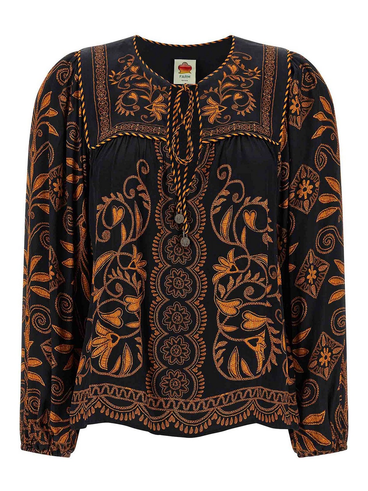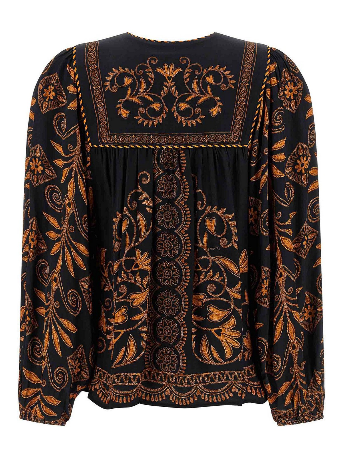Cornely Ainika aus Stoff in Seidenoptik mit Allover-Print, weiche Passform mit weiten, am Saum gekräuselten Ärmeln mit Gummizug, verstärkte Schultern mit zweifarbigen Besätzen, V-Ausschnitt auf der Vorderseite mit geknoteter Spitze mit Anhänger.