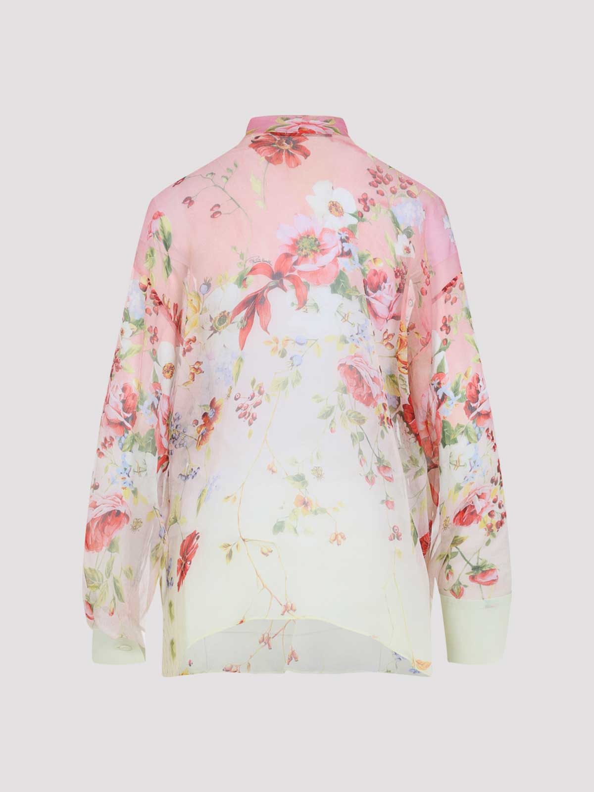 Roberto Cavalli Miami Flowers Seidenbluse in Grün und Rosa. Hergestellt aus grünem und rosafarbenem Seidenchiffon mit durchgehendem Blumendruck. Sie verfügt über einen runden Ausschnitt mit selbstbindendem Verschluss, einen Ausschnitt auf der Vorderseite, lange, weite Ärmel mit Manschetten und Belüftungsakzenten sowie einen ausgestellten Saum.
