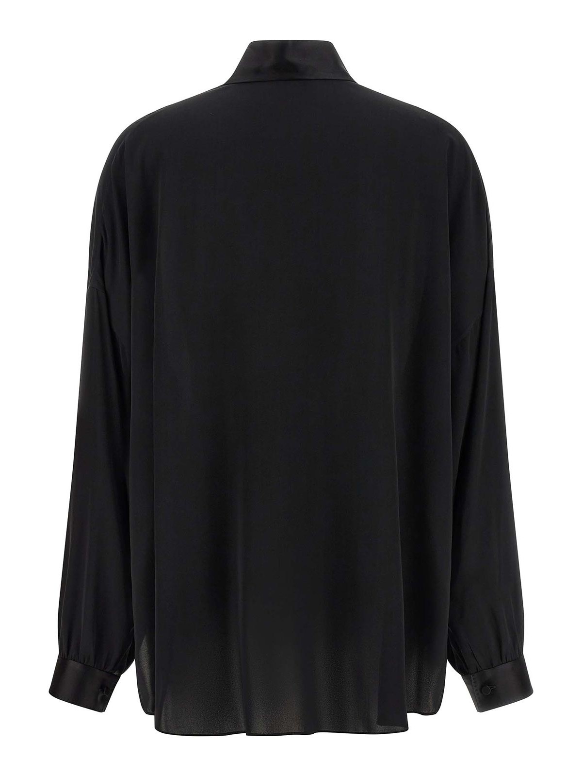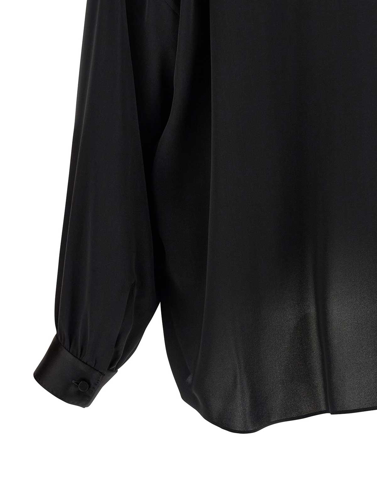 Georgettebluse aus gewaschener Seide mit farblich abgestimmten Satindetails, Lavallire-Ausschnitt mit V-Ausschnitt, lange Ärmel mit Manschetten und abgesenkten Schultern, Seitenschlitze.
