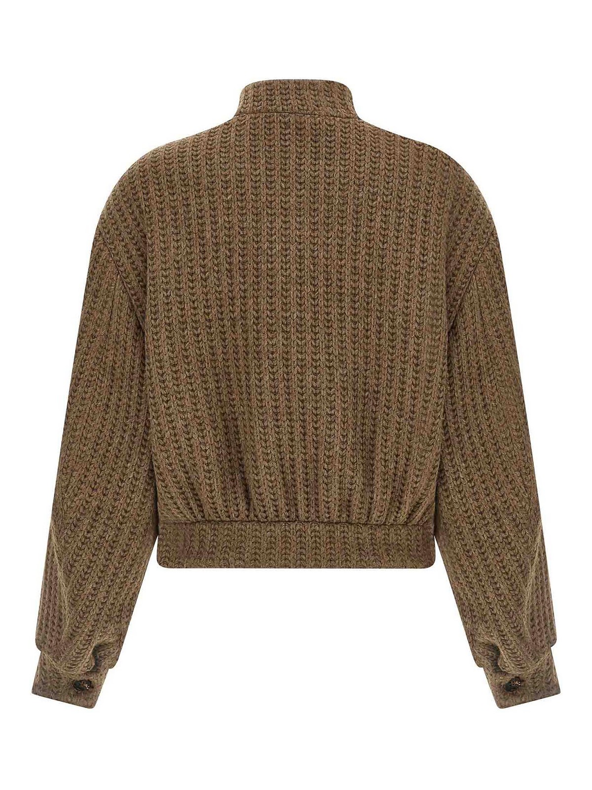 Bomberjacke aus gestrickter Wolle, Mandarinenkragen, Knopfverschluss, abnehmbares Blumenbroschendetail.
