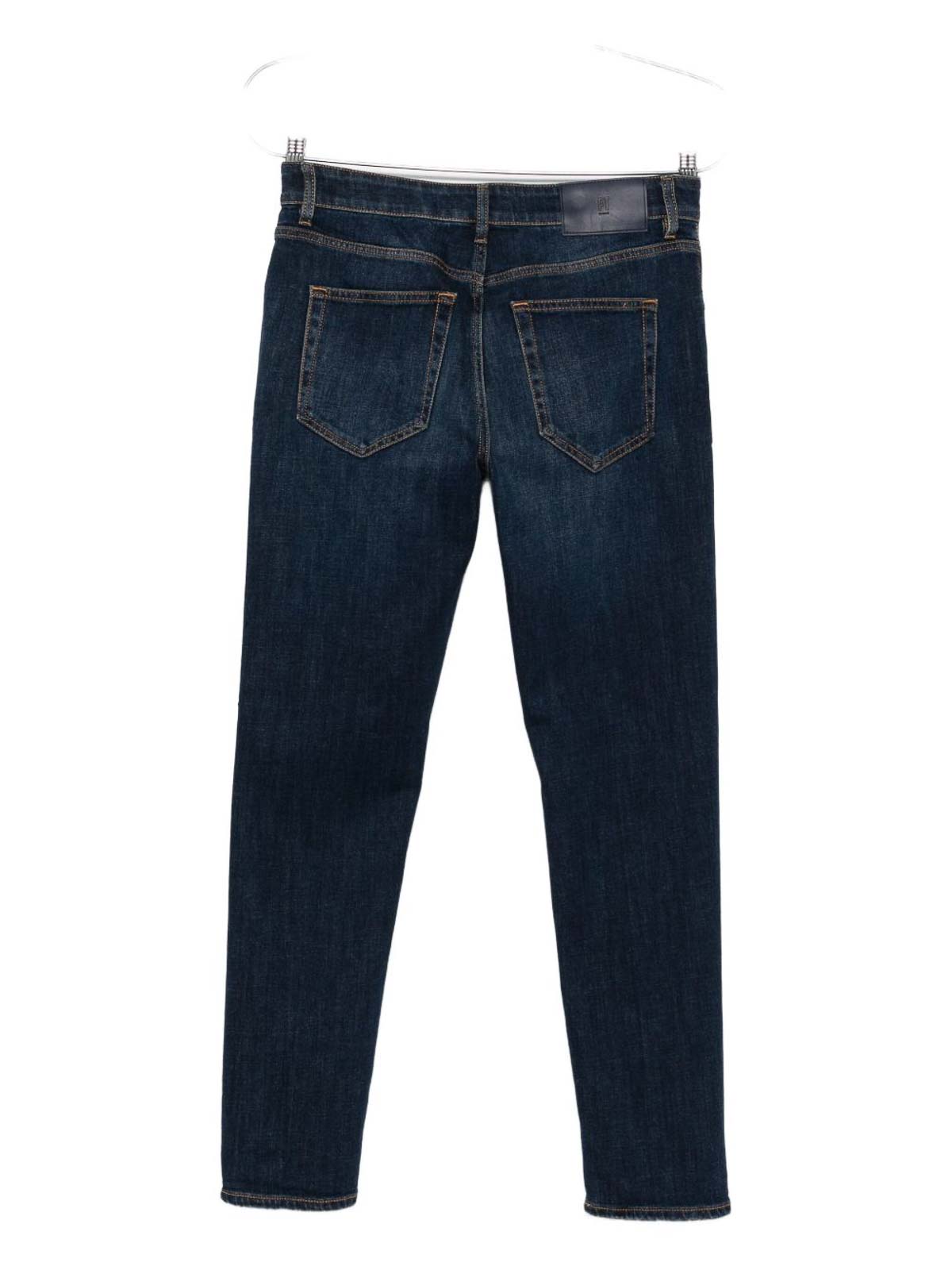 Dunkelblauer, klassischer Hosenbund mit fünf Taschen und Knöpfen, Schlaufen und geradem Bein
