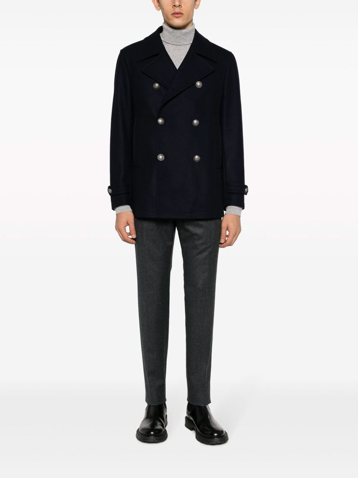 Zweireihiger Mantel aus Virgin_wool von Tagliatore mit marineblauem Schurwolle-Kaschmirgemisch, gekerbtem Revers, zweireihiger Knopf, lange Ärmel, geknöpfte Manschetten, zwei seitliche eingesetzte Taschen, gerader Saum und mittiger Rückenschlitz