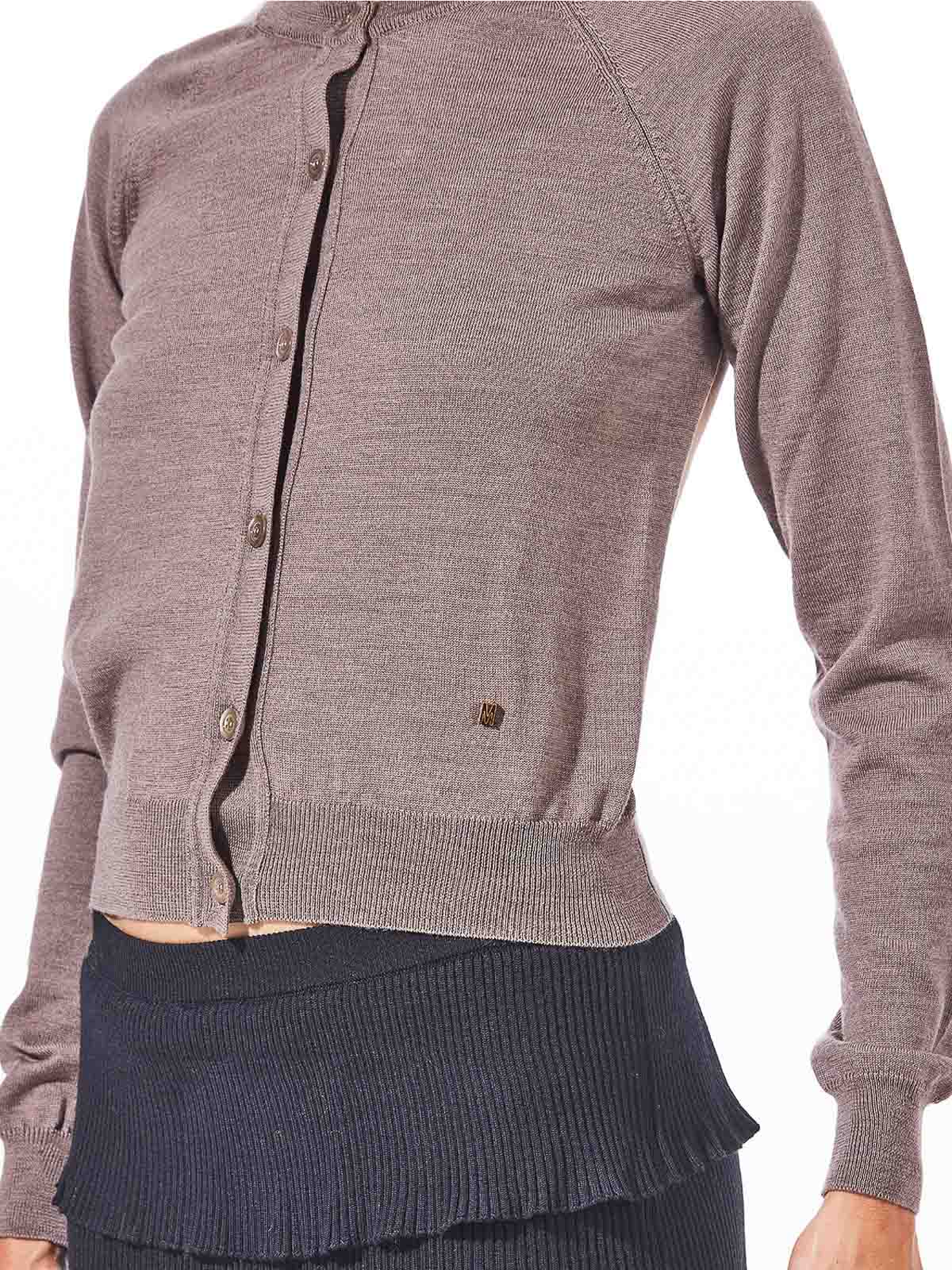 Cardigan mit offenem Rücken in Beige, Strickjacke mit Rückenausschnitt und vergoldetem M, repräsentativ für die Marke im Relief auf der linken Seite., Ausschnitt auf der Rückseite, goldfarbenes Metallic-M auf der linken Seite, Frontverschluss mit Knopfverschluss, Rundhalsausschnitt, lange Ärmel, gerippter Saum und Bündchen, Farbe: Beige, 100% Schurwolle, hergestellt in Italien,.