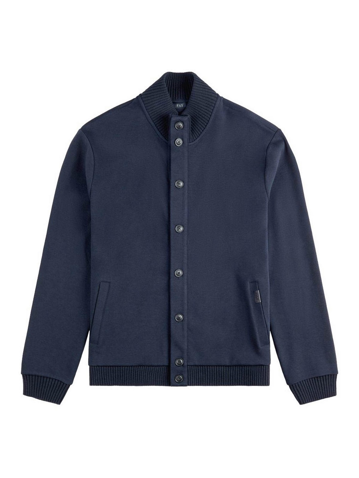 Cardigan aus blauer Baumwolle mit Knopfverschluss, Leistentaschen und gerippten Borten von Fay mit Rundhalsausschnitt und Logo-Patch. Diese Strickjacke ist ideal für lässige, schicke Outfits oder raffinierte Tageslooks und vereint Komfort, modernen Stil und hochwertige Handwerkskunst