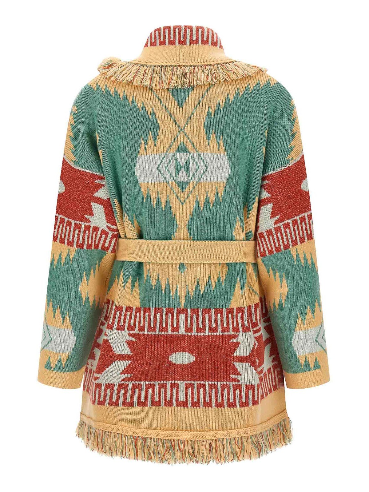 Icon' Kaschmir-Cardigan mit doppeltem Jacquard-Allover-Muster „Alanui“, Morgenmantel-Stil mit Schalausschnitt und ausgefransten Kanten, lange Ärmel, Taschen, abnehmbarer Gürtel.
