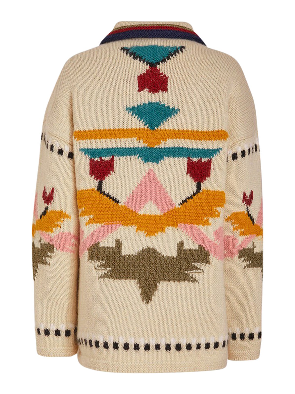 Strickjacke aus gemischter Schurwolle und Alpaka-Jacquard, verziert mit geometrischen Teppichmotiven und kontrastierenden Oberflächen, verziert mit Pegasus-Knöpfen. Passform über Hemdkragen, Vordertaschen, applizierter einreihiger Verschluss mit Pegas