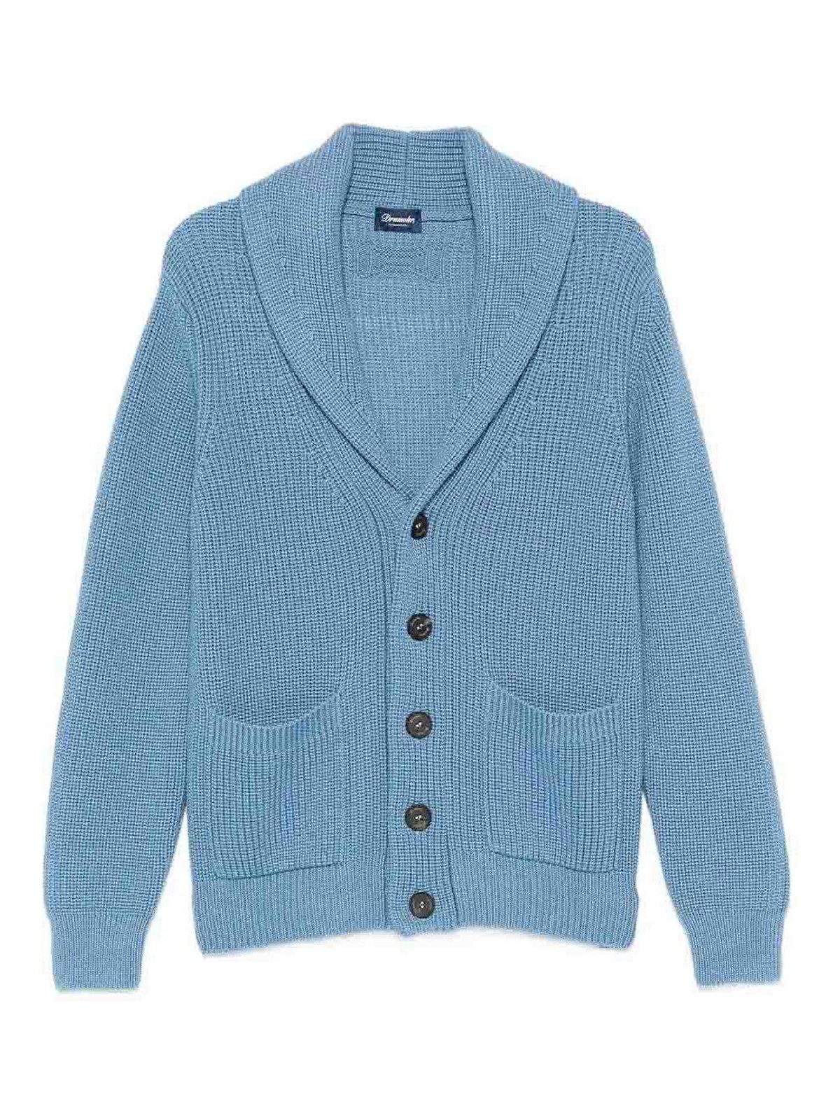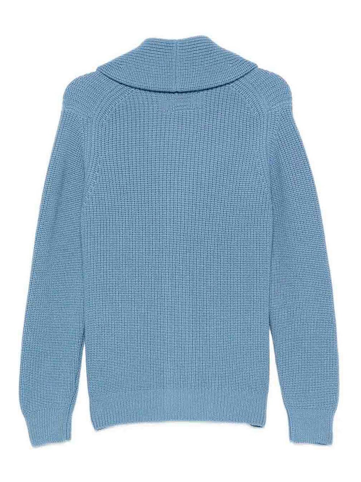 , Schalkragen, Rippstrick, Knopfverschluss, aufgesetzte Taschen, lange Ärmel