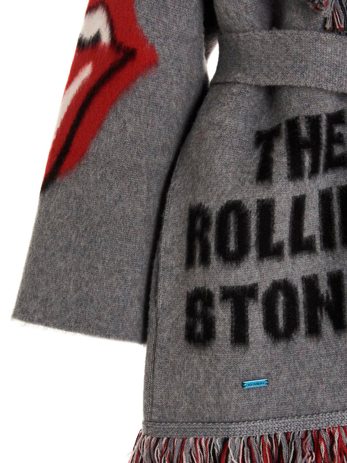 Rolling Stones Kapsel-Cardigan aus Wolle mit kontrastfarbener Intarsie, Fransen an den Kanten, Taschen und abnehmbarem Hüftgurt.