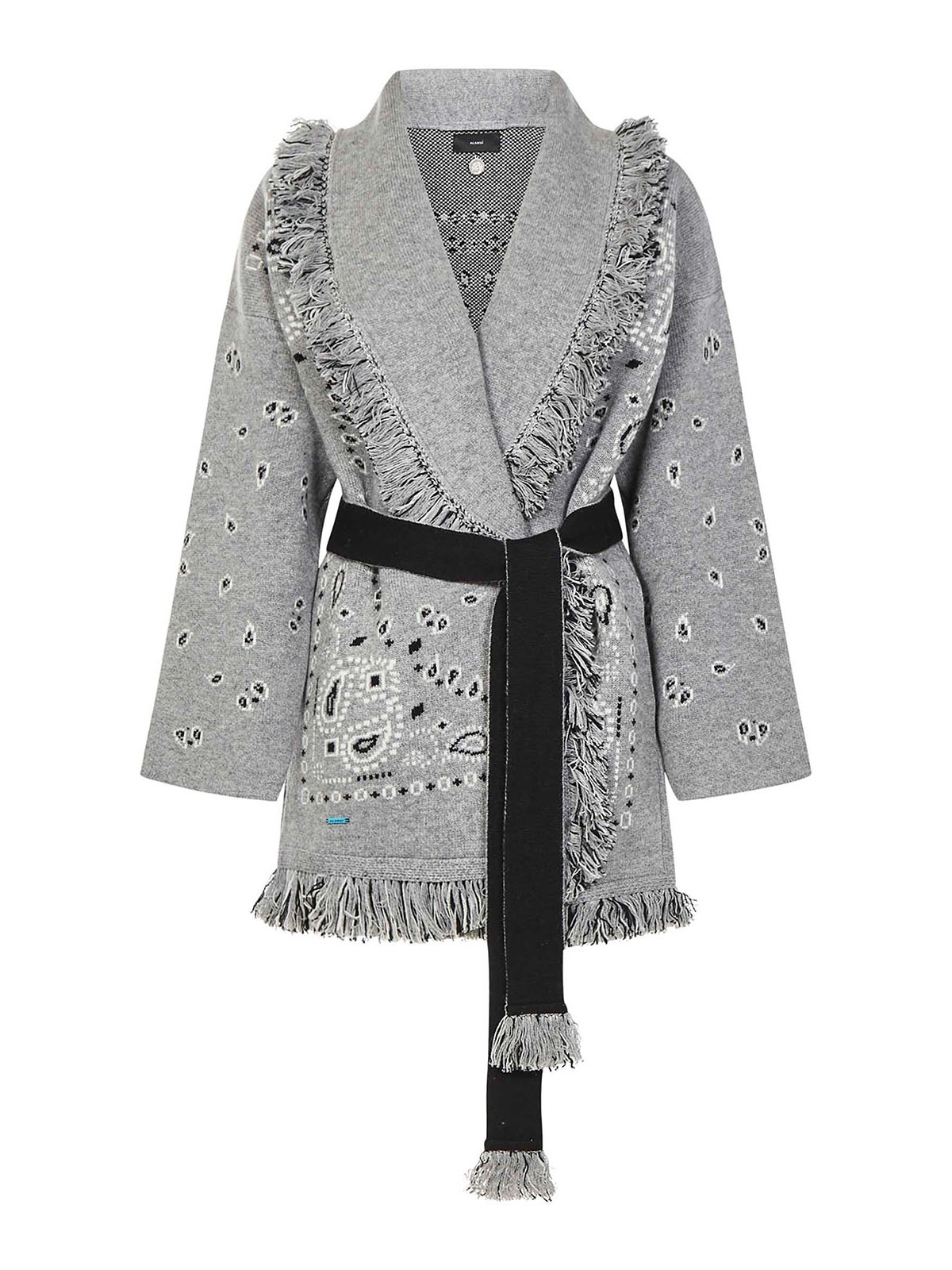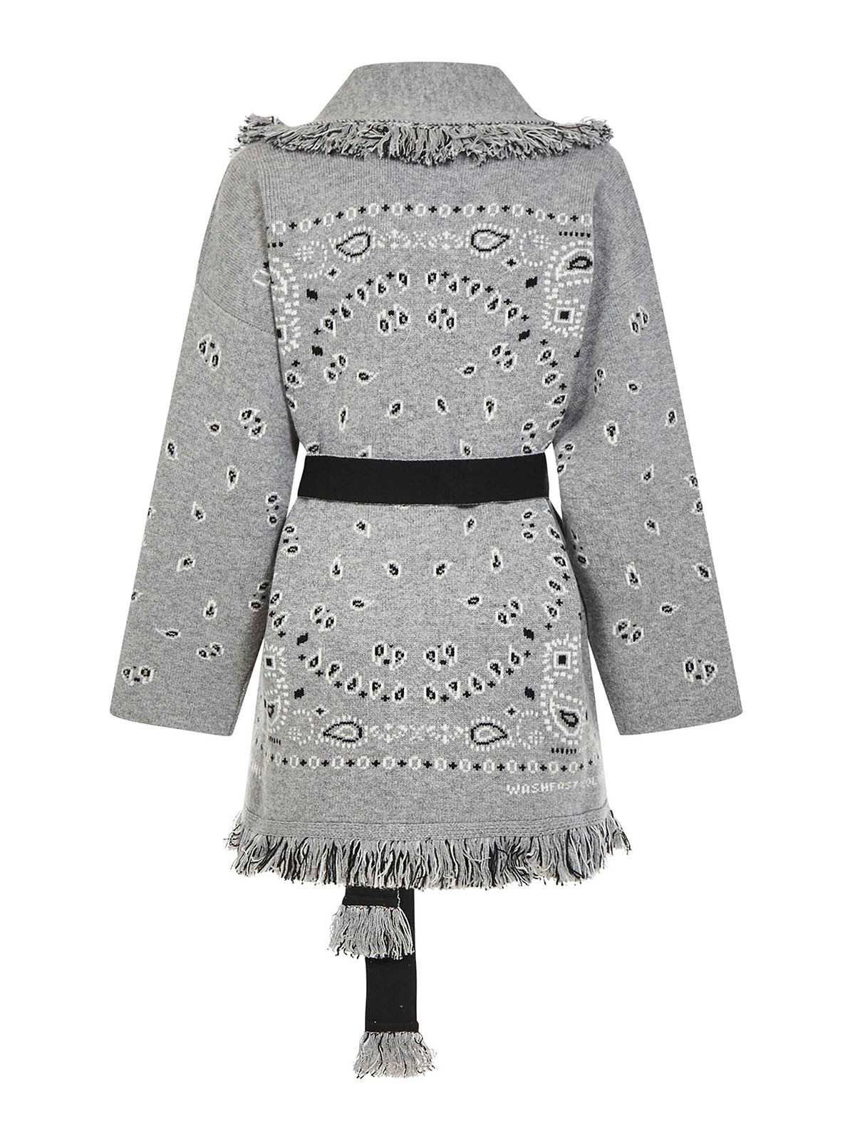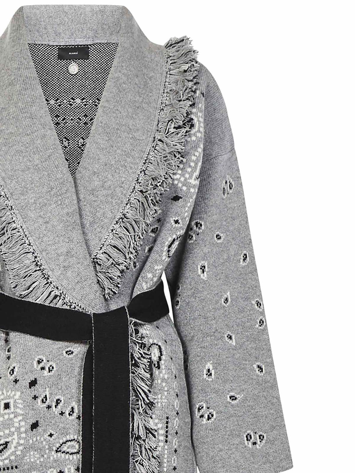 Verschluss mit zweifarbigem, passendem Gürtel an der Taille, Schalkragen mit ausgefransten Kanten, lange Ärmel; Seitentaschen, Fransen, Bandana-Muster in kontrastierendem, durchgehendem Jacquard-Logo, aufgenäht, übergroßes, graues Label