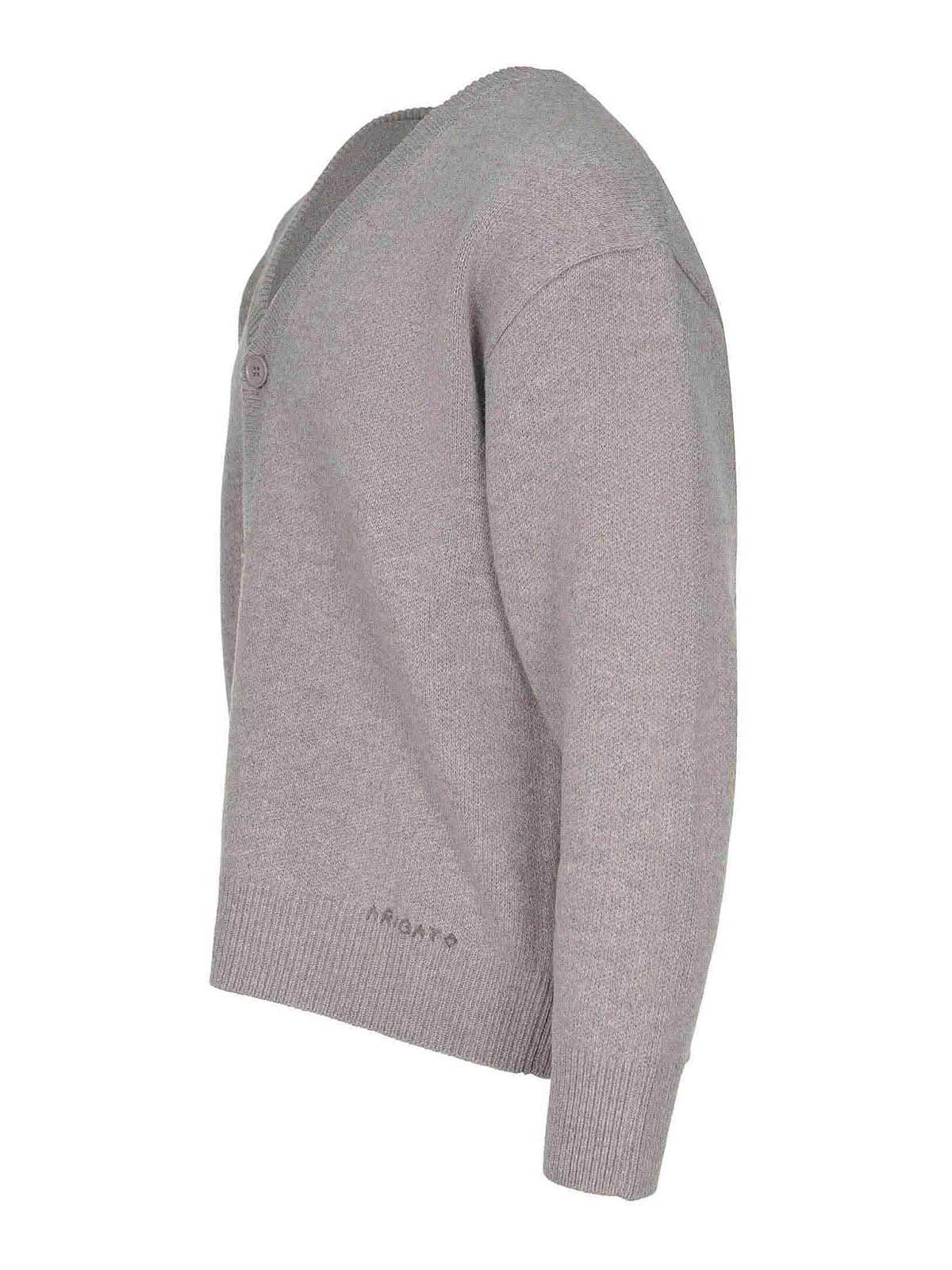 Axel Arigato Cardigan aus taubengrauer Wolle. V-Ausschnitt. Knopfverschluss auf der Vorderseite. lange Ärmel. Gestickter Logo-Schriftzug in Kontrastfarbe an der Unterseite. Rippstrickbündchen an Ärmeln und Saum. 100% Lammwolle.