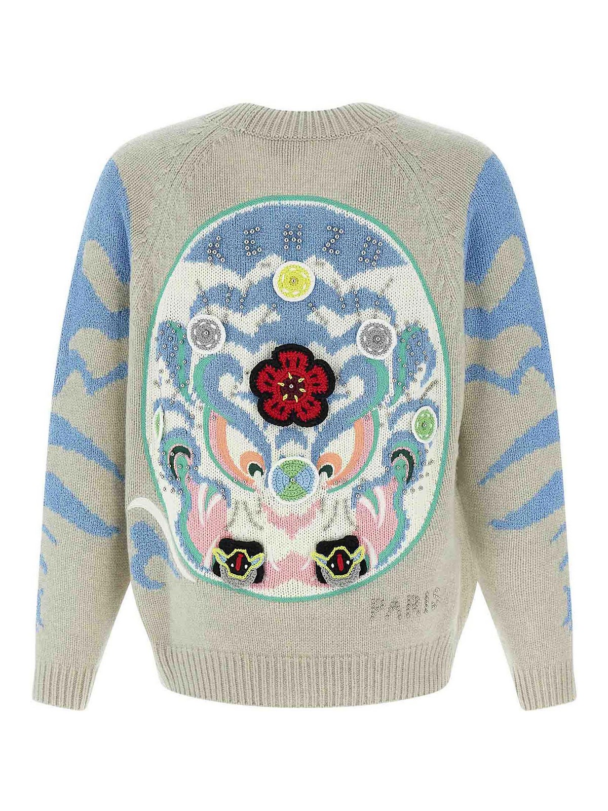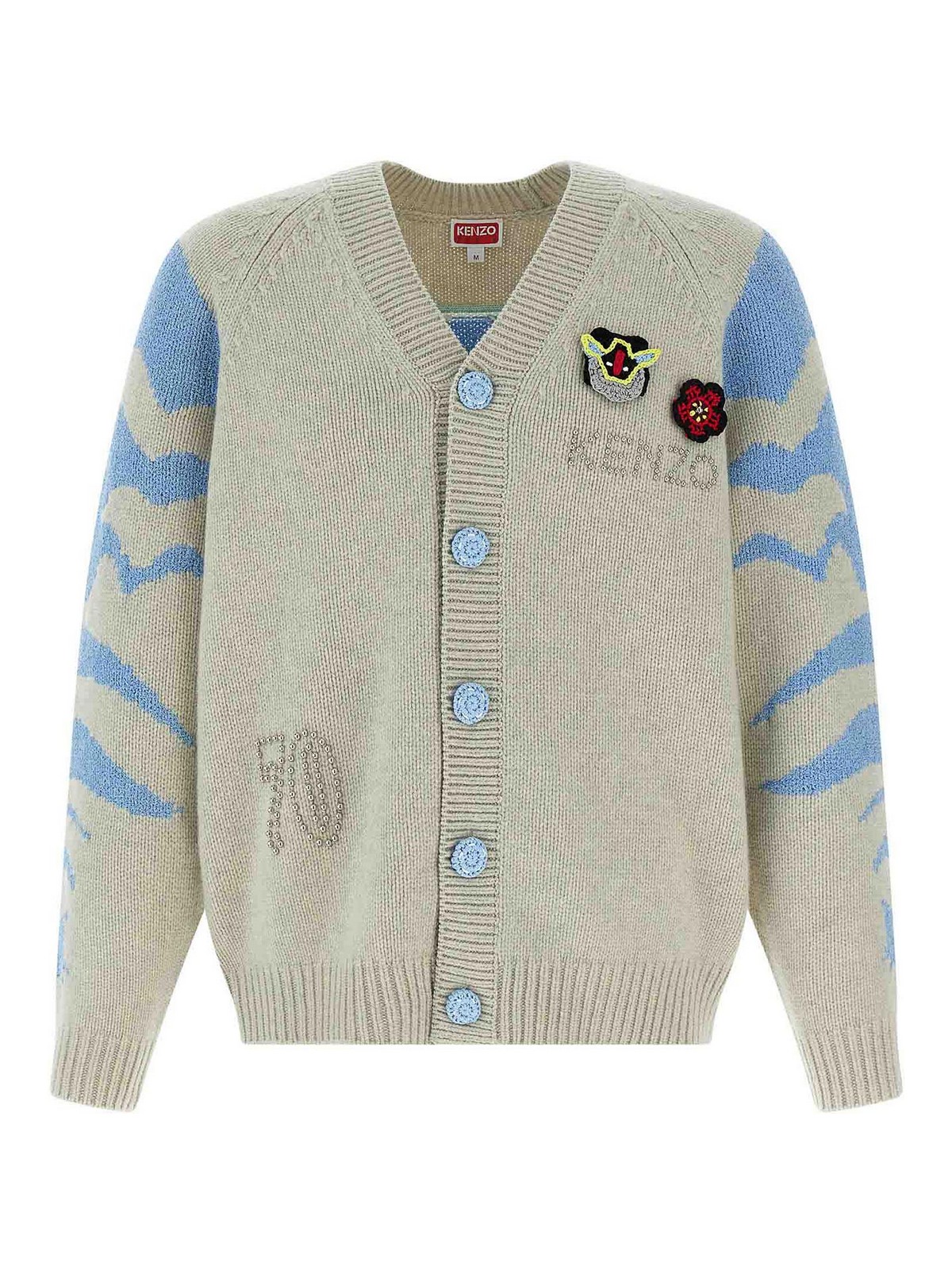 Pachinko Strickjacke aus Wollmischung, Häkeleinlagen und Applikationen, Nietenlogo aus Metall, Knopfverschluss, lange Manschettenärmel.