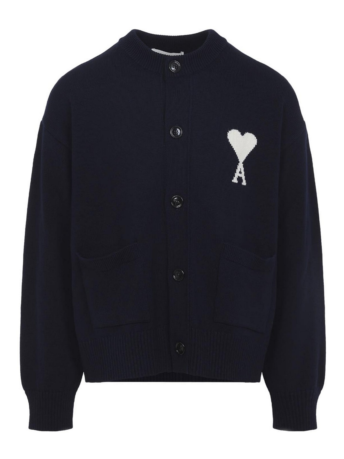 Ami-Blaue Strickjacke aus Wolle und Baumwolle. Hergestellt aus einer blauen Mischung aus Schurwolle und Baumwolle. Mit Rundhalsausschnitt, Knopfverschluss auf der Vorderseite, kontrastierendem Logo-Inlay auf der Brust, zwei aufgesetzten Taschen auf der Vorderseite, abgesenkten Schultern, langen Ärmeln und gerippten Kanten.