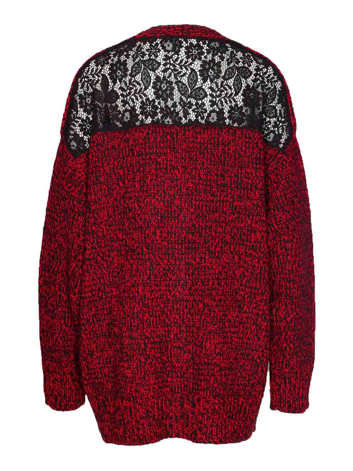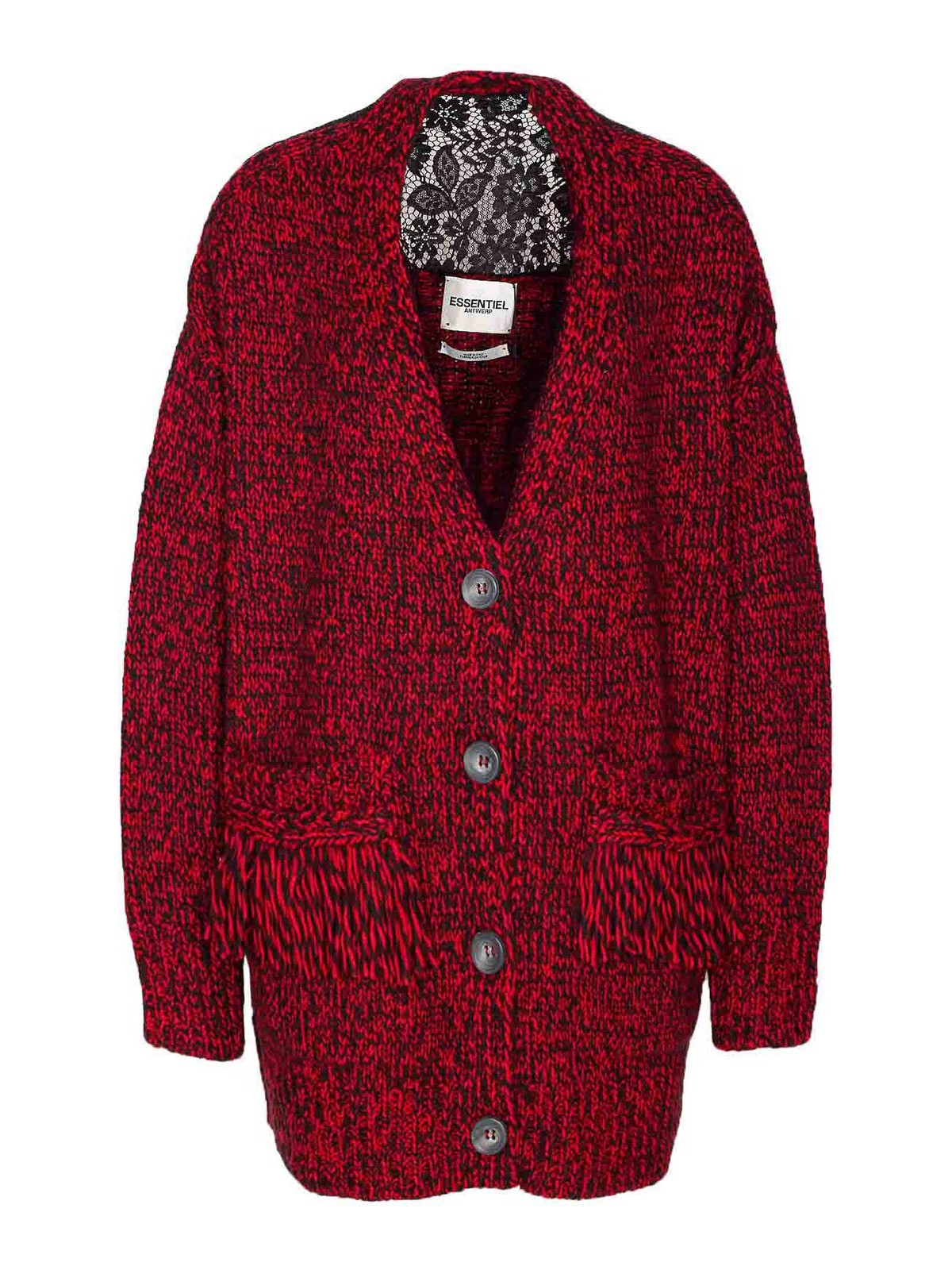 Essentiel Antwerpenrote Strickjacke, V-Ausschnitt, Knöpfe, Fronttasche mit Fransen, Spitze auf der Rückseite, Designer-Farbbezeichnung: Rot