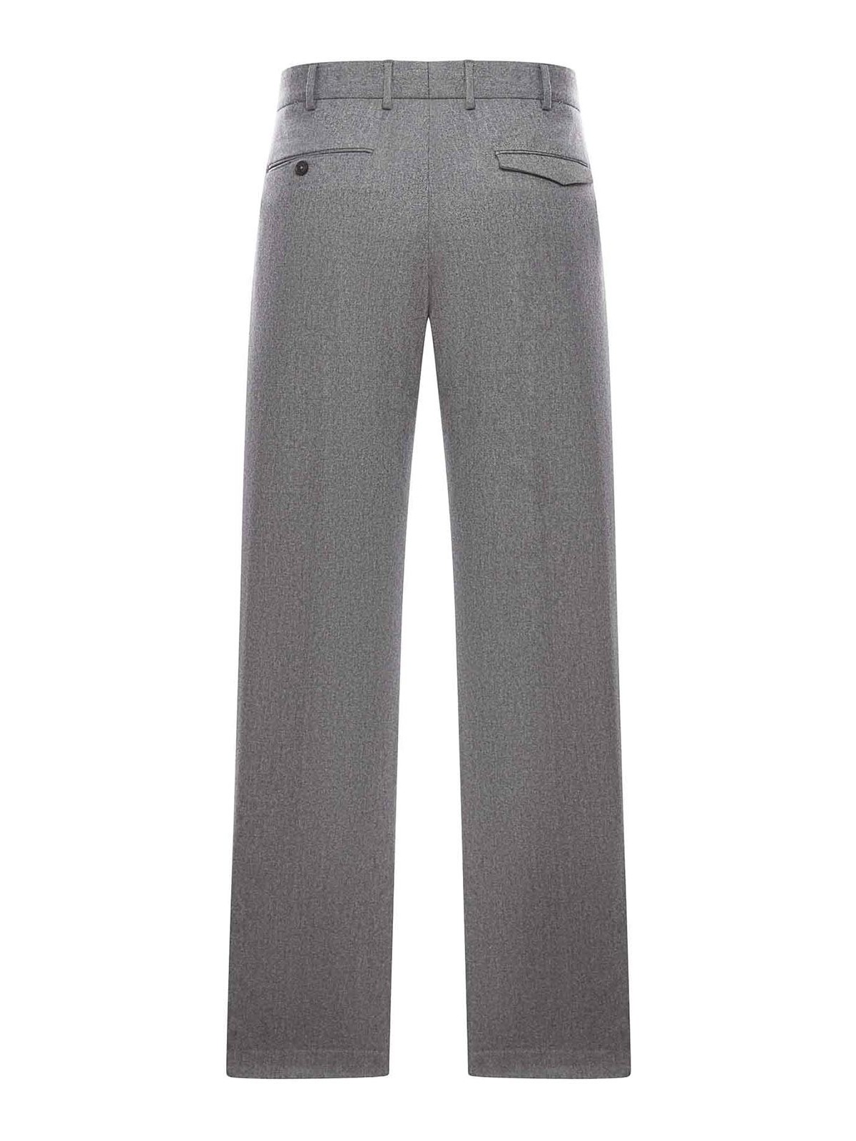 Wollhose, gerades Bein, Gürtelschlaufen, Knopf, zwei Seitentaschen, Gesäßleistentasche mit Klappe, Gesäßleistentasche mit Knopf, gerader Saum, grau