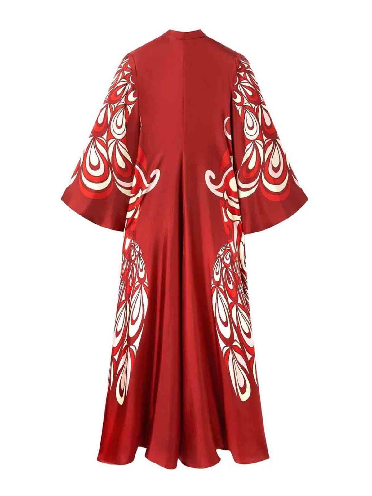 Seidentwill, handappliziertes Muster, Stehkragen, Hinterschärpe, Wasserfallärmel, versteckte Seitentaschen, V-Ausschnitt, langes, leicht ausgestelltes Design. Kann entweder mit Vorder- oder Hinterausschnitt getragen werden. Zusammensetzung 100% Seide, hergestellt in Italien