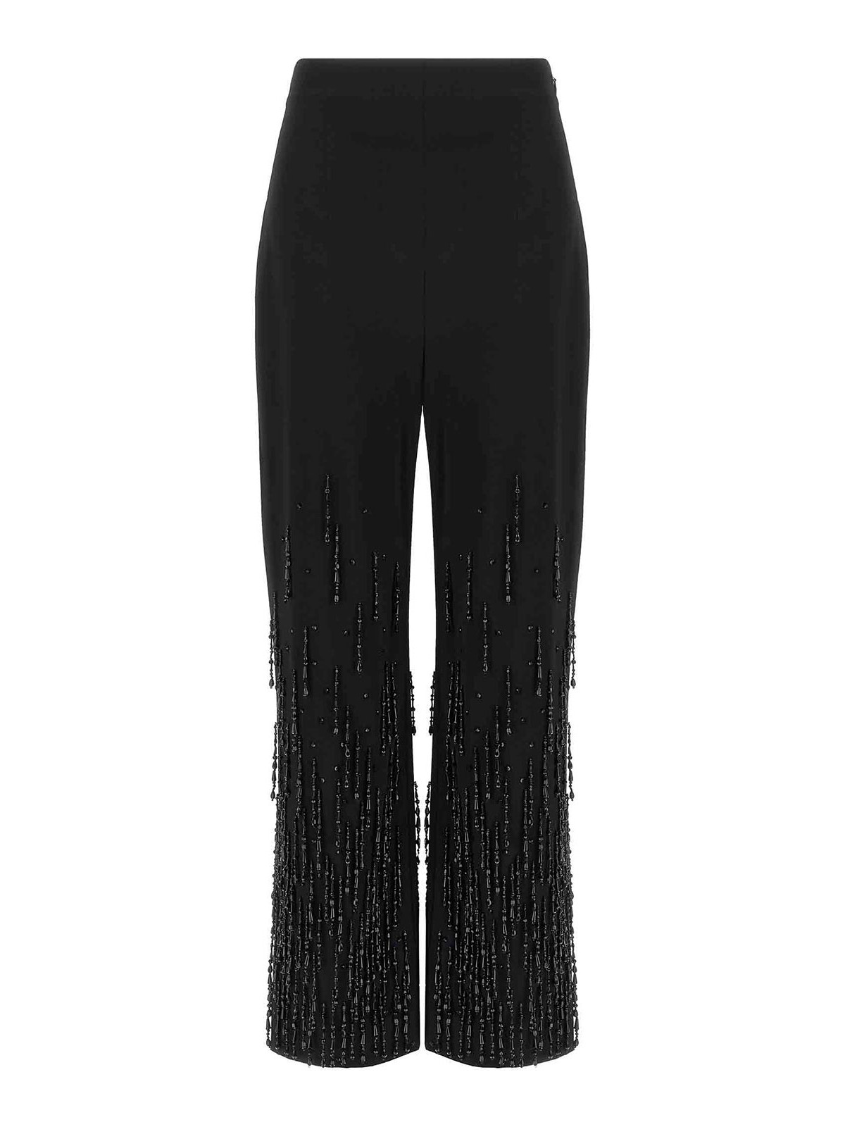 Hose aus Stretchwolle, hoher Bund, verdeckter seitlicher Reißverschluss, leicht breites, gerades Bein am Saum mit Perlenverzierung.