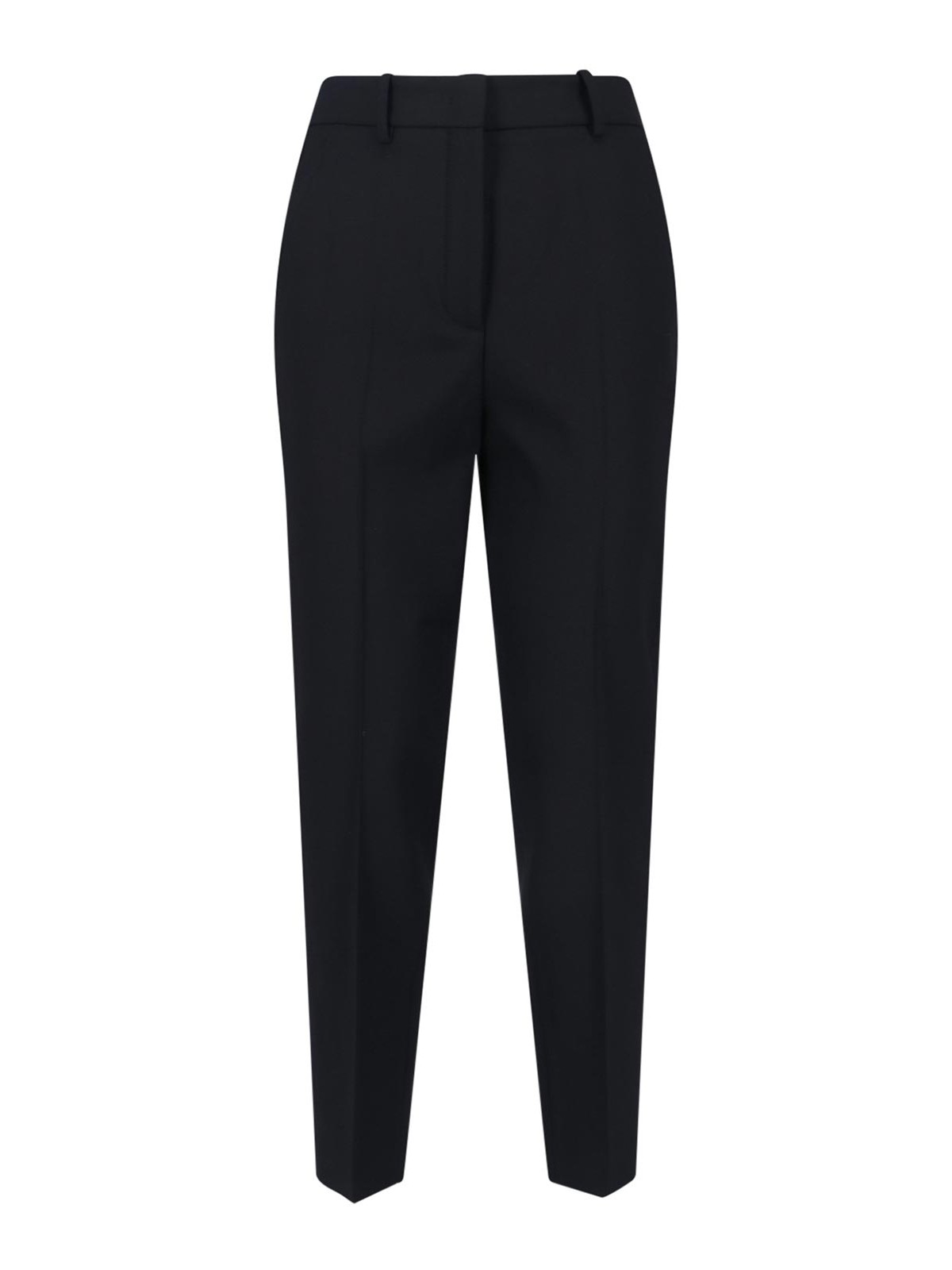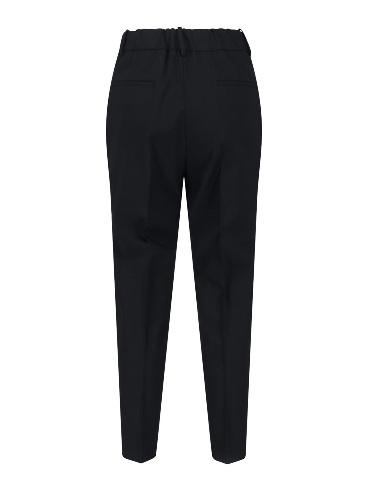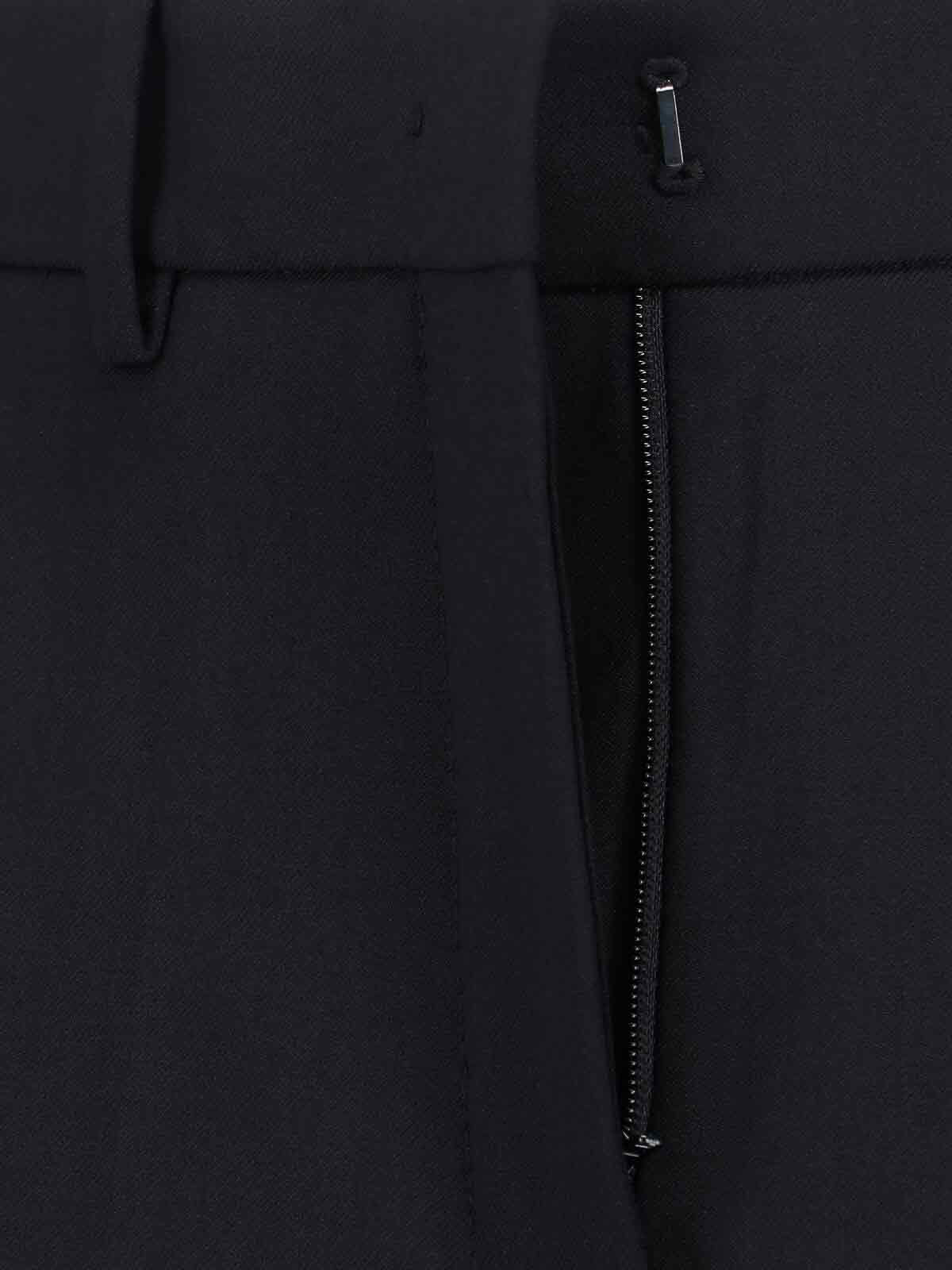 Gerade Incotex-Hose aus schwarzer Schurwolle, mittelgroßer elastischer Bund, Gürtelschlaufen, Haken- und Reißverschluss, zwei Seitentaschen, zwei Leistentaschen hinten, gerades Bein.