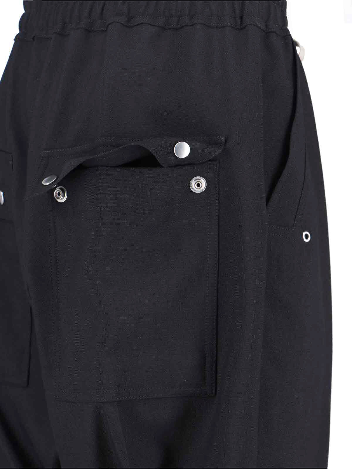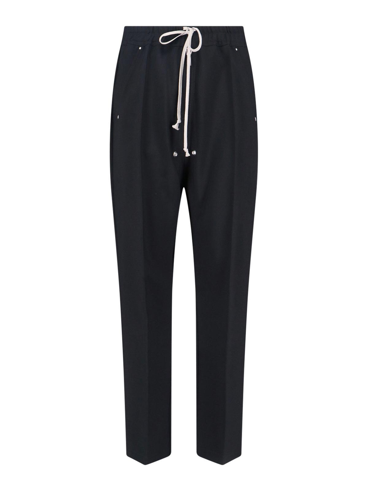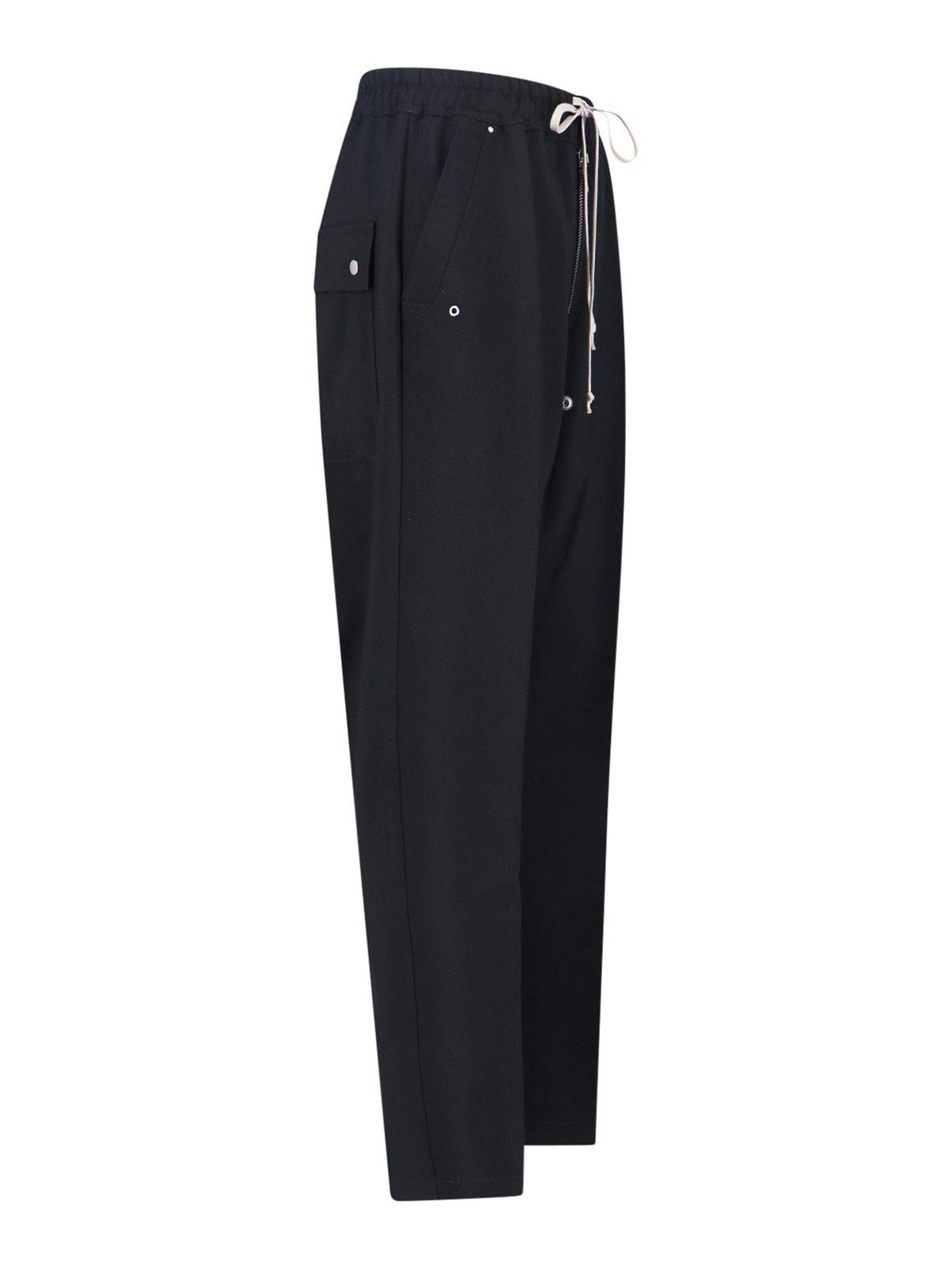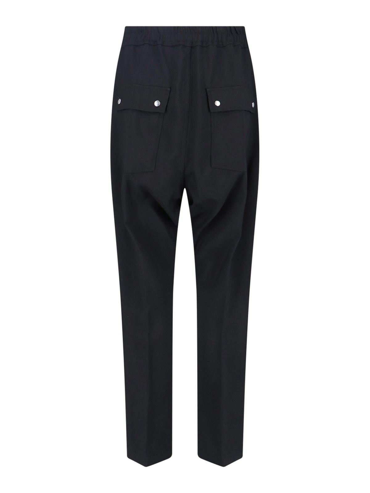 Gerade geschnittene Hose von Rick Owens aus schwarzer Wolle, mittelgroßer elastischer Bund, Kordelzug und Reißverschluss, zwei Seitentaschen, Knopfdetails auf der Vorderseite, zwei hintere Pattentaschen, gerades Bein.