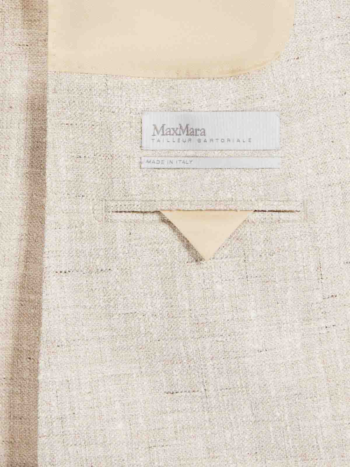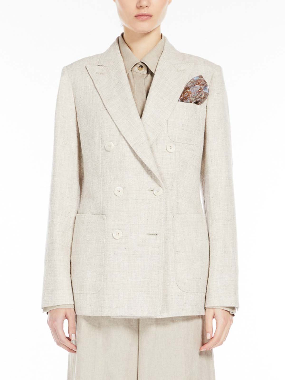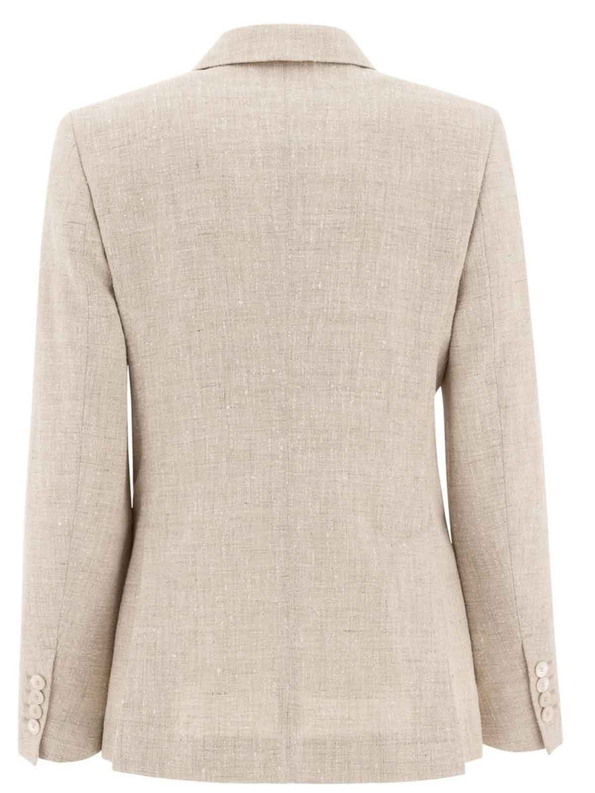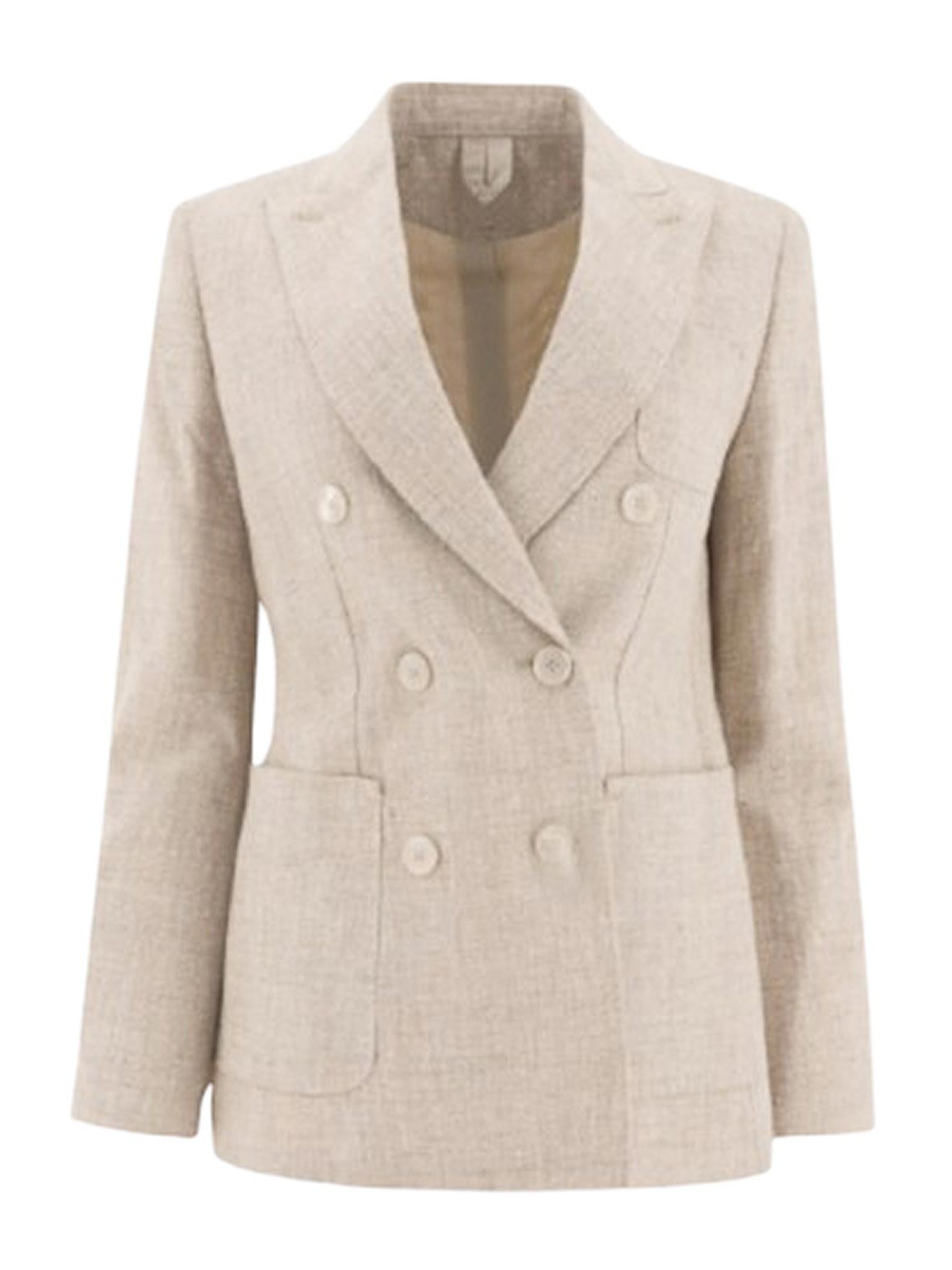 Doppelreihiger Blazer, feine Mischung aus und mit einer raffinierten und leichten Textur versehen, verleiht das Frittenmuster dem einen rustikalen Effekt in natürlichen Farbtönen, sorgt für ein angenehmes Tragegefühl und hervorragende Leistung. Die Konstruktion verfügt über ein spitzes Revers und drei aufgesetzte Taschen an der, während die taillierte Silhouette mit einem gerippten Strick und Seitenschlitzen auf der Rückseite halb, gefüttert Modell in kontrastierendem Elfenbein, farbig mit Mutter, von, Knöpfen, abgeschlossen